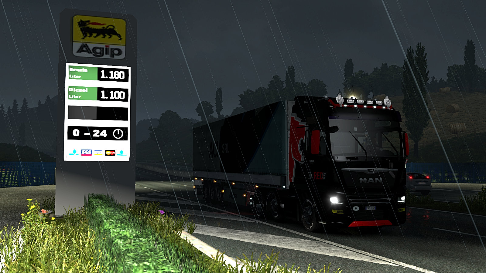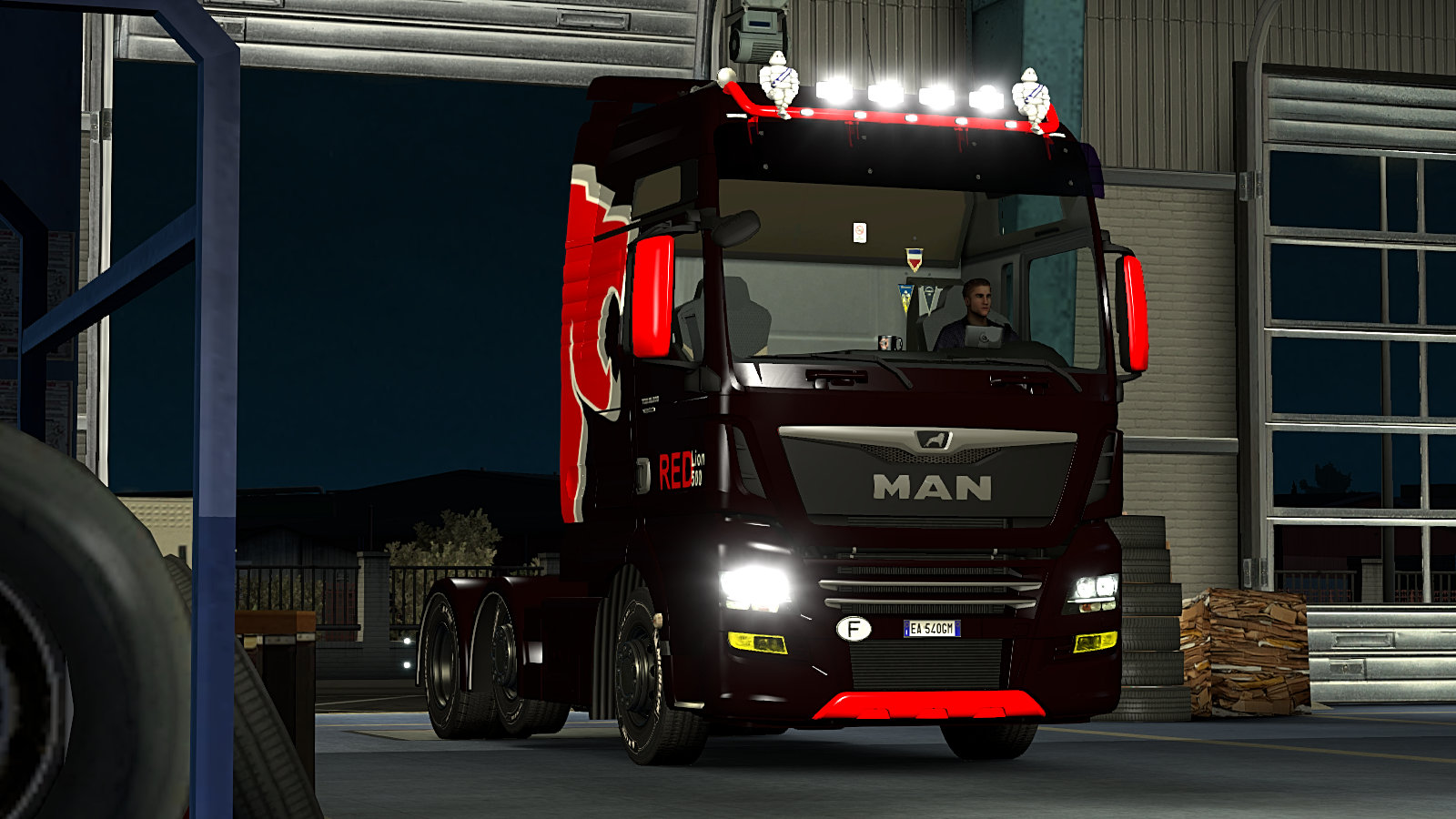 After carrying out 18 jobs in the current Scania S series I decided it was time to buy a Euro 6 MAN TGX to get a direct comparison. I was parked up in Milano where I’d also taken the opportunity to buy a garage and expand our company into northern Italy. I ordered the TGX online from the dealer in Marseille for delivery to Milano. She was to have the top of the range XXL cab with highest spec interior. The engine was to be the D38 500HP with a 12 speed Tipmatic gearbox and retarder. Finally, she was going to be finished in a special Red Lion paint scheme. In game configuration and ordering takes longer than delivery; which is instant – don’t you wish it was like that in the real world! On delivery her first job was a delivery of Pesto from Milano to our home town, Montpellier. Here she is after completing that delivery, parking up for the night at our garage…