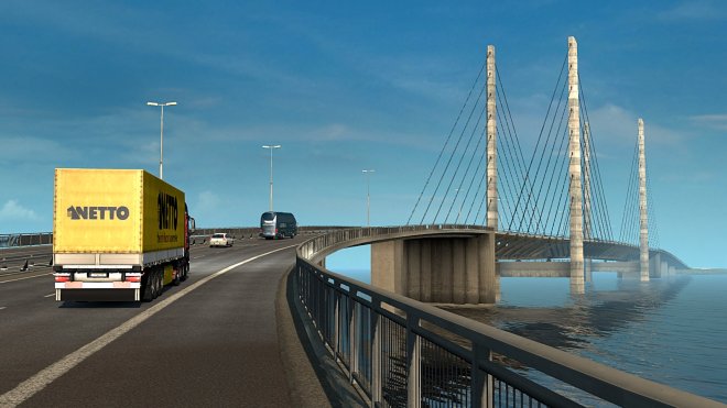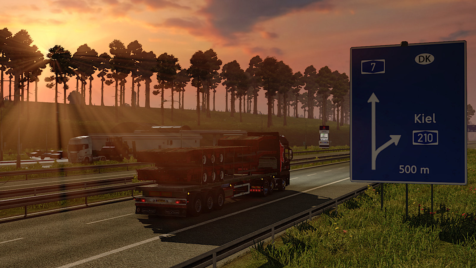 I completed the challenge over a period of a week with deliveries from/to the following countries:- Italy, Czech Republic, Poland, Denmark, Germany, France, Switzerland, Great Britain, Norway and Holland. The last run was a load of flatbed trailers from Amsterdam to Linköping which is illustrated fittingly with a sunset shot…