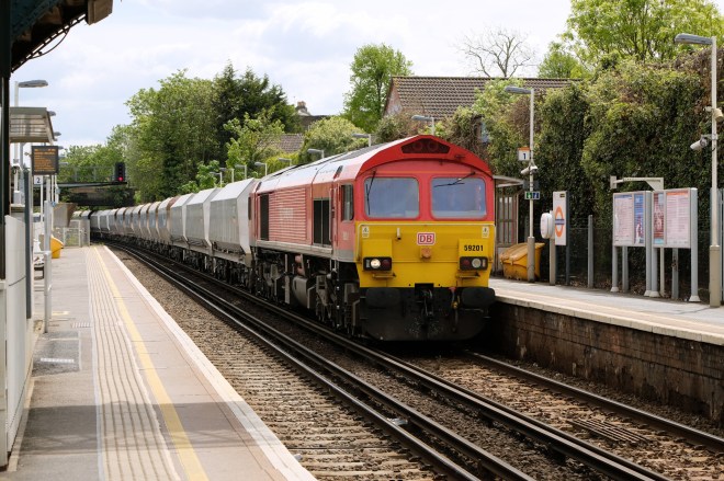 After the hour spent in north London it was off across the Thames and a visit to Wandsworth Road to try and catch a possible 14 freight services passing through there between 12:00 and 14:00. Most of these services are ‘as required’ and in the event only 6 of them ran of which I photographed 5. Here is 59201 with the 6V18 Allington to Whatley Quarry empty hoppers…