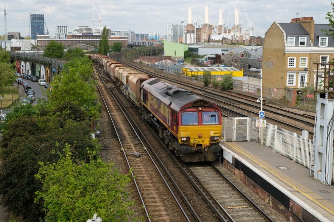 With Battersea Power Station and the new housing that has replaced the famous gas holder as a backdrop, 66147 hauls the 6Y08 Tolworth to Cliffe Brett Marine across Factory Junction and into Wandsworth Road station…