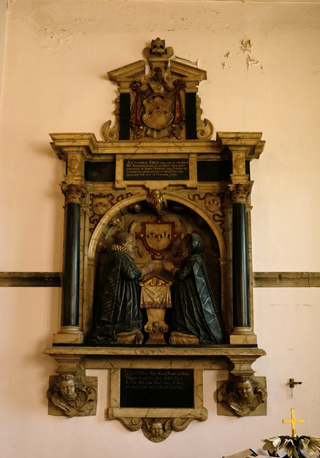 …though originally it may have had cherubs mounted on the plinths at the top on either side. If so they’ve been lost somewhere along the way as the church has grown. Alexander Kinge was an Auditor of the Exchequer and the Royal Mint for Queen Elizabeth I and he continued in royal service under King James I.