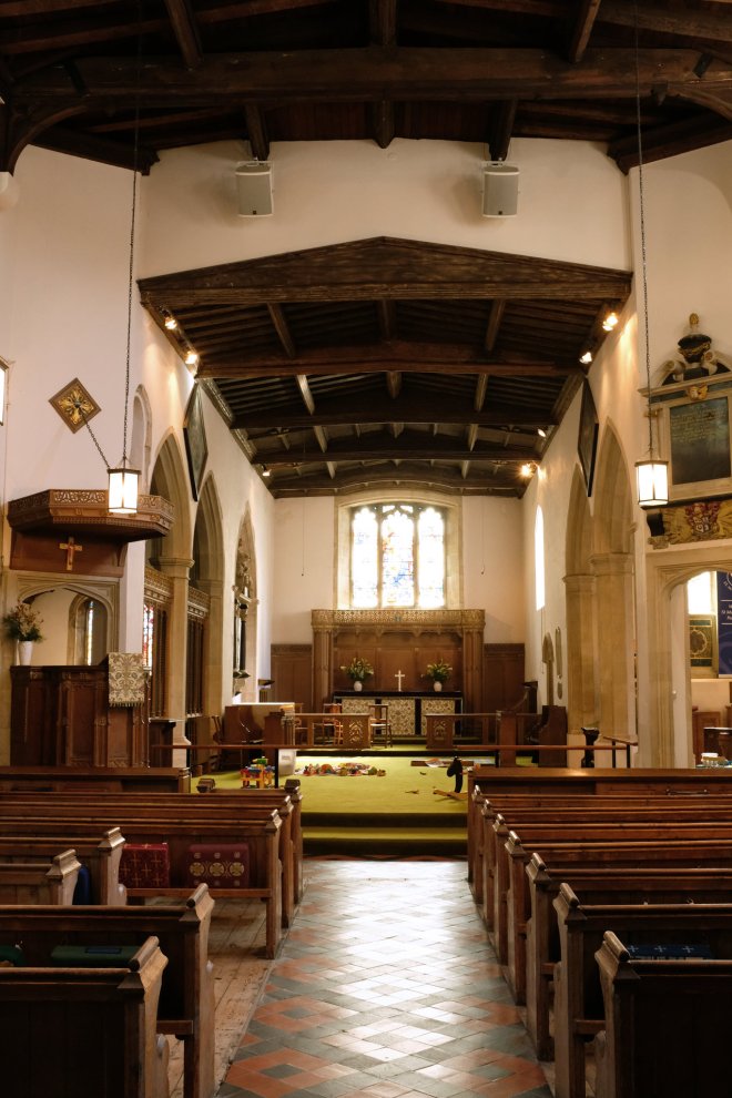 The toys scattered on the carpet by the altar are there for the resident play-group who were coming in as I was taking the photos. The altar end of the church was damaged by bombing in 1940 and was rebuilt in 1953 when the church was given its current makeover.