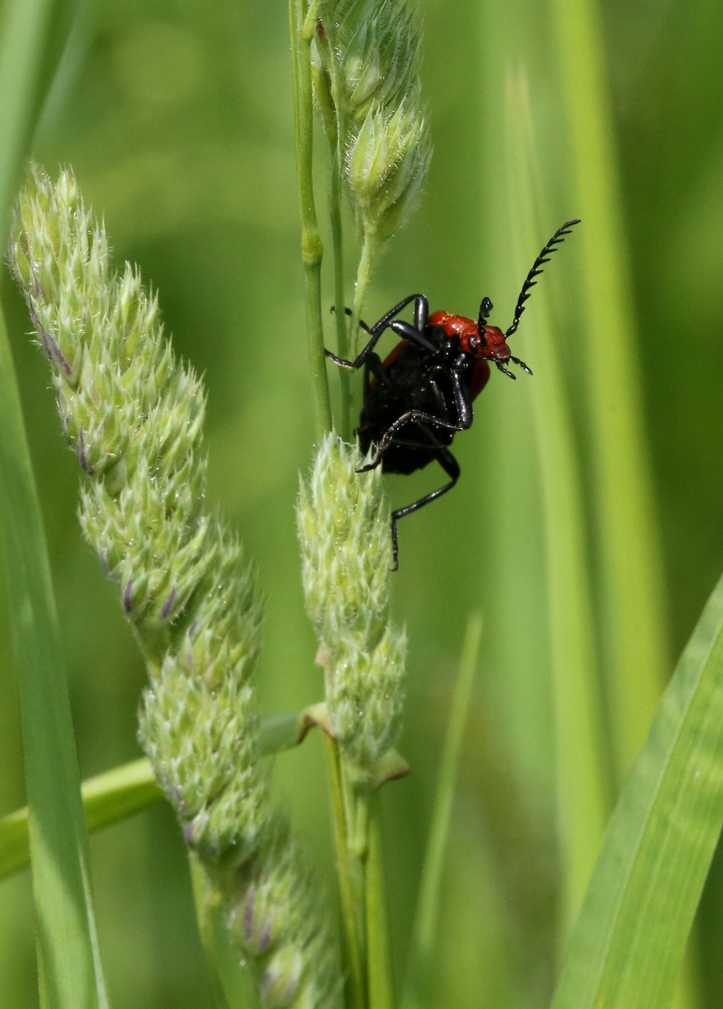From the top this insect is all red but the underparts are all pure beetle-black. Get a load of those wonderful antennae 🙂 This is a Red-headed Cardinal Beetle (Pyrochroa serraticornis). It is a predator that feeds on other insects. The red colour suggests to other predators that it is toxic…