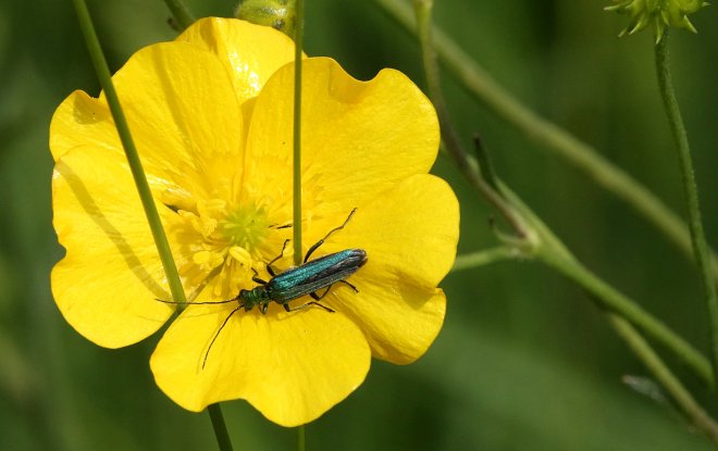 Here is a colourful example feeding on the pollen of a Meadow Buttercup at Long Lane Pasture. This is a female Swollen-thighed Beetle (Oedemera nobilis) – the male has the enlarged thighs that gift this beetle its name…