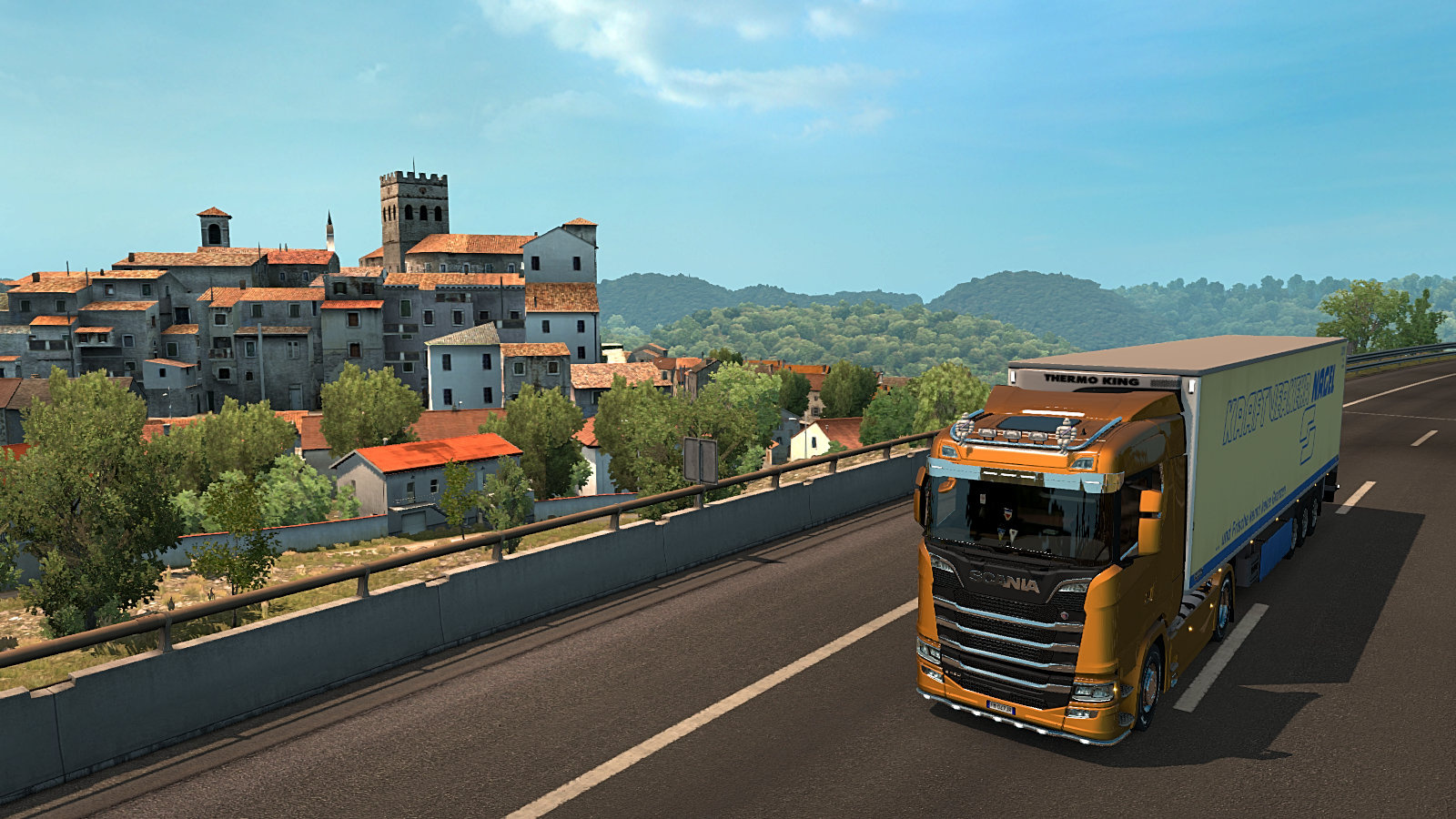 And here is an example of where the developers have taken a real world scene and brought it into the game. The Commune of Roviano sits beside the E80 route across Italy between Roma and Pescara. The game version sits closer to the road than in real life but it is so well modelled that I had no problem finding it on Google Maps 🙂 Here we’re taking a load of Sausages to Ancona with our Scania S.