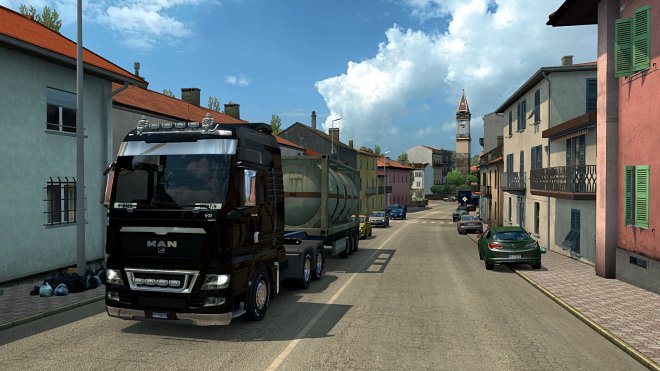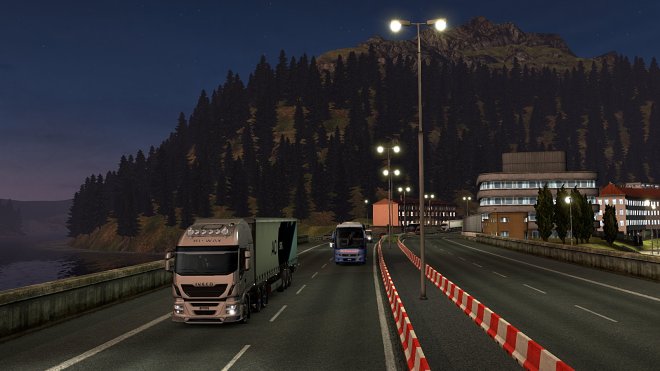 Here’s another section of the E35, crossing Lake Lugano with a load of Racing Components for the current in-game event. Again, whilst I can find the location in the real world the developers have gone more for the feel than for accuracy. The good news is that changes to the older maps to improve them have begun in Germany and SCS have shown some before and after images on their Blog.