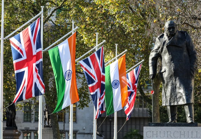 Flags of the UK and India in Parliament Square on the occasion of a state visit by Indian Prime Minister Narendra Modi in 2015…