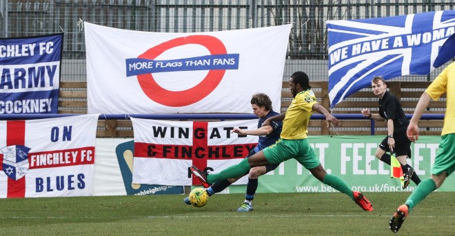 Playing down the wing with Wingate & Finchley supporters flags. The more Flags than Fans boast is almost true 😉