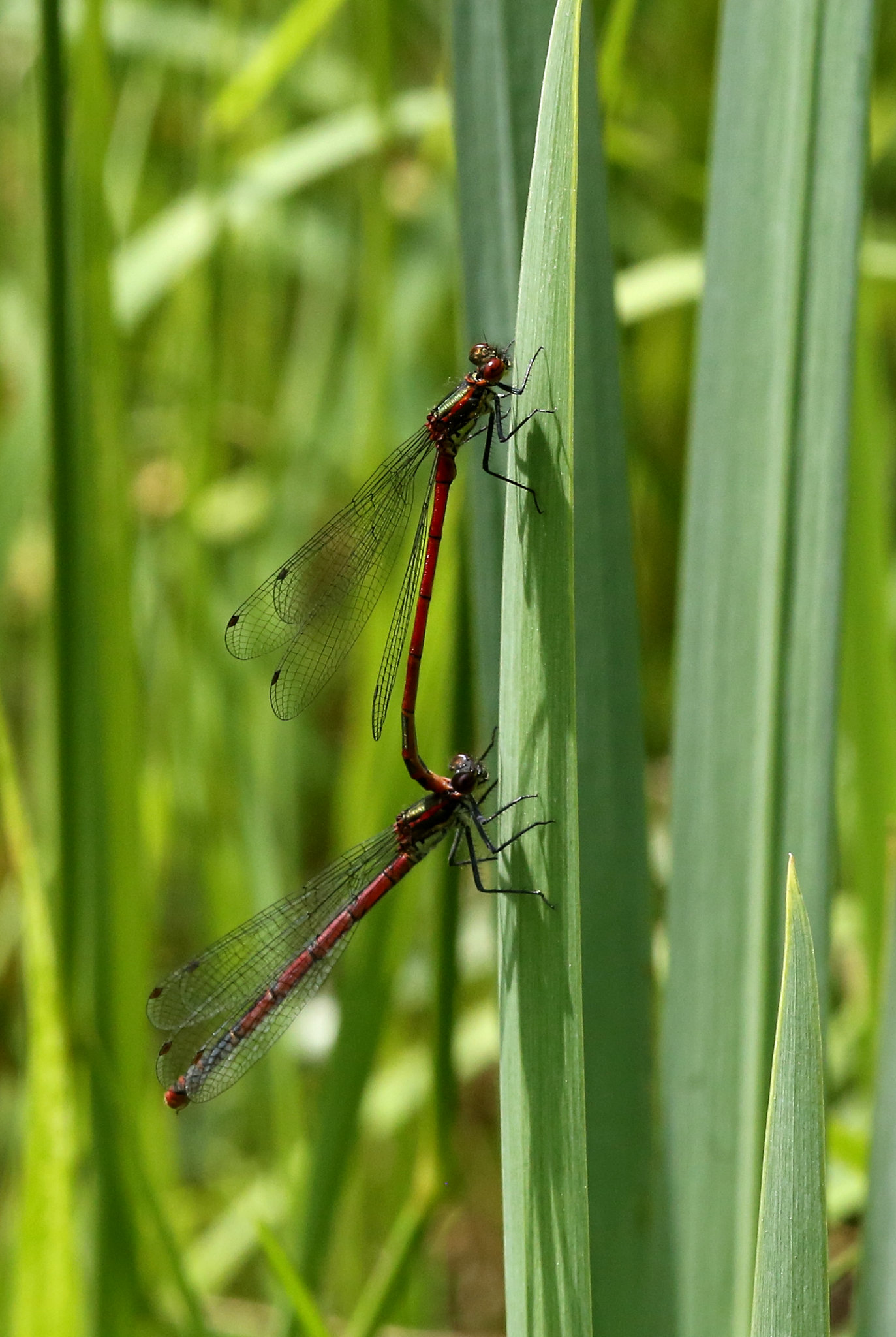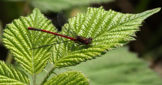 In the sun of the Bank Holiday weekend Long Lane Pasture was full of life. I showed some images of beetles in a previous post. Here are some Damselflies. Two species were active during my visits. The Large Red Damselfly – here basking on a bramble leaf…