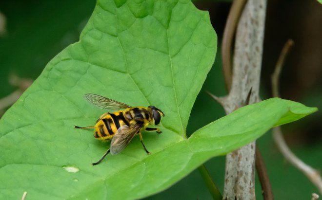 David Attenborough (now Sir) once introduced Hoverflies as superb aeronauts. That, they most certainly are with the ability to hover motionless in a pool of sunlight and yet to dart off in pursuit of a rival in such a sudden manner that you wonder if the behaviour of alien spacecraft in the X-Files or Close Encounters are modelled on them! They mimic bees and Wasps in their black and gold colouration as a defence against predators. Here are a few that I have photographed in the last couple of weeks at Long Lane Pasture. Sometimes they do take a rest stop which helps 😉