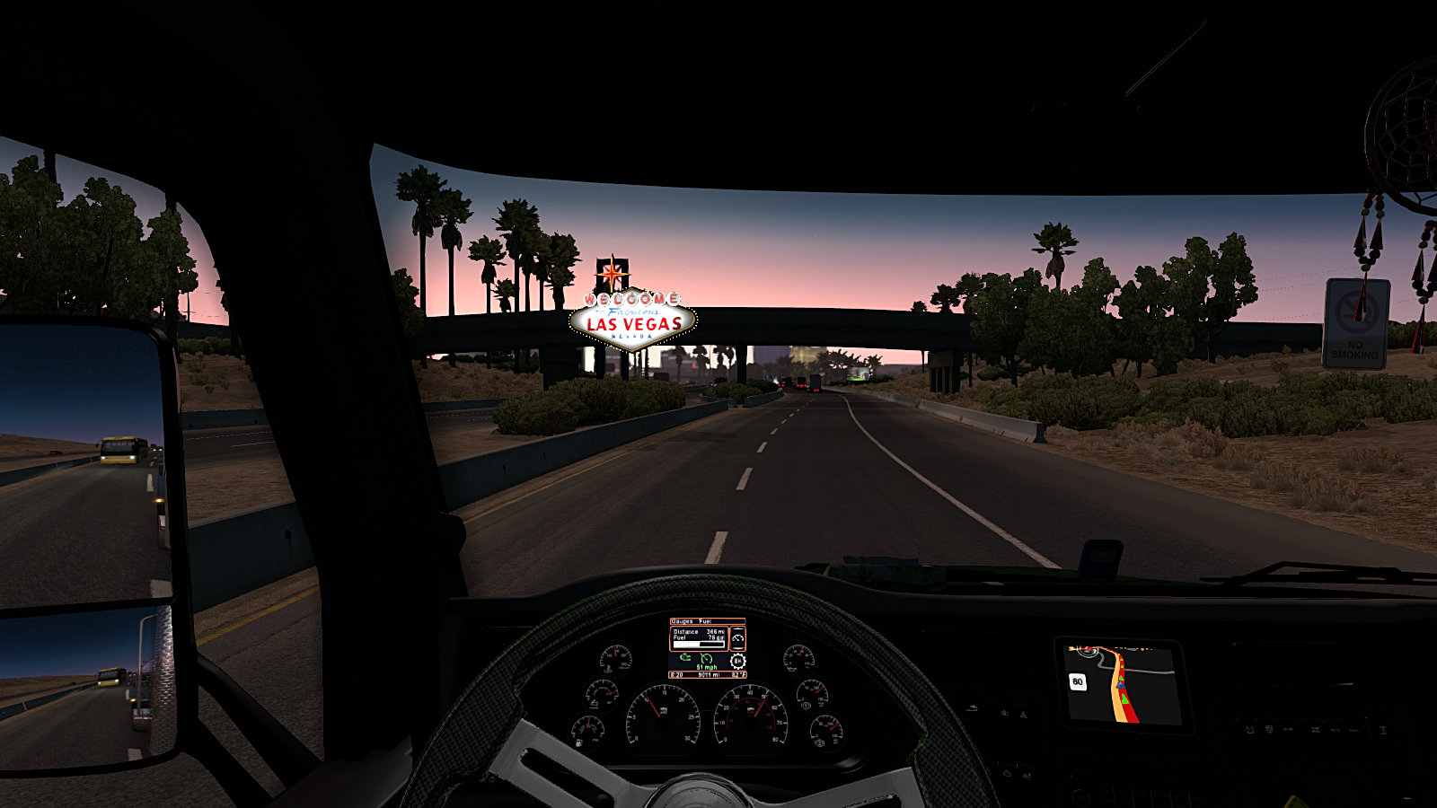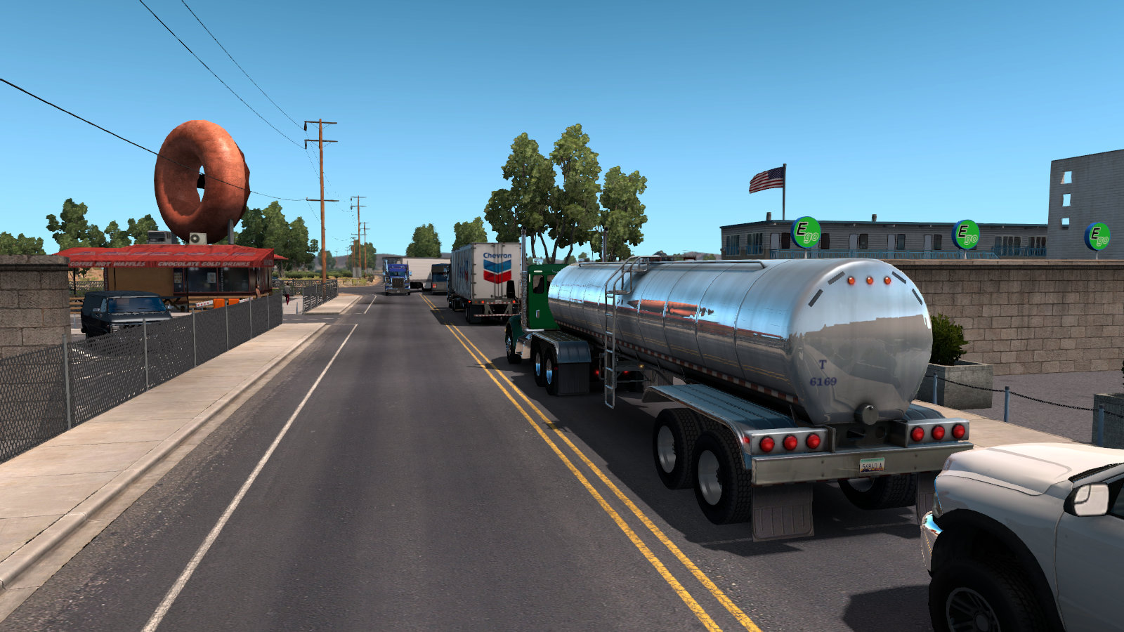 By the way – I would have completed within my 11 hour shift! I want to tell you about another run to illustrate how much type of road, weight of load and gradients affect the time a journey will take. I picked up a load of Milk in Yuma which was bound for Las Vegas. Although the tanker is about the same size as a fuel tanker it’s almost twice the weight because of the greater density of milk compared with petroleum. In the real world you’d probably pick up Route 95 straight away but the southern section of that road isn’t on the game map so it’s Interstate 8 west to El Centro and then Route 111 north towards Indio. Around halfway along the 111 there’s a small town which I suspect represents Calipatria. There’s a busy crossroads here that you really have to slow down for and take your turn with the other traffic. Then, at the other end of town you will probably come to a scene like this…