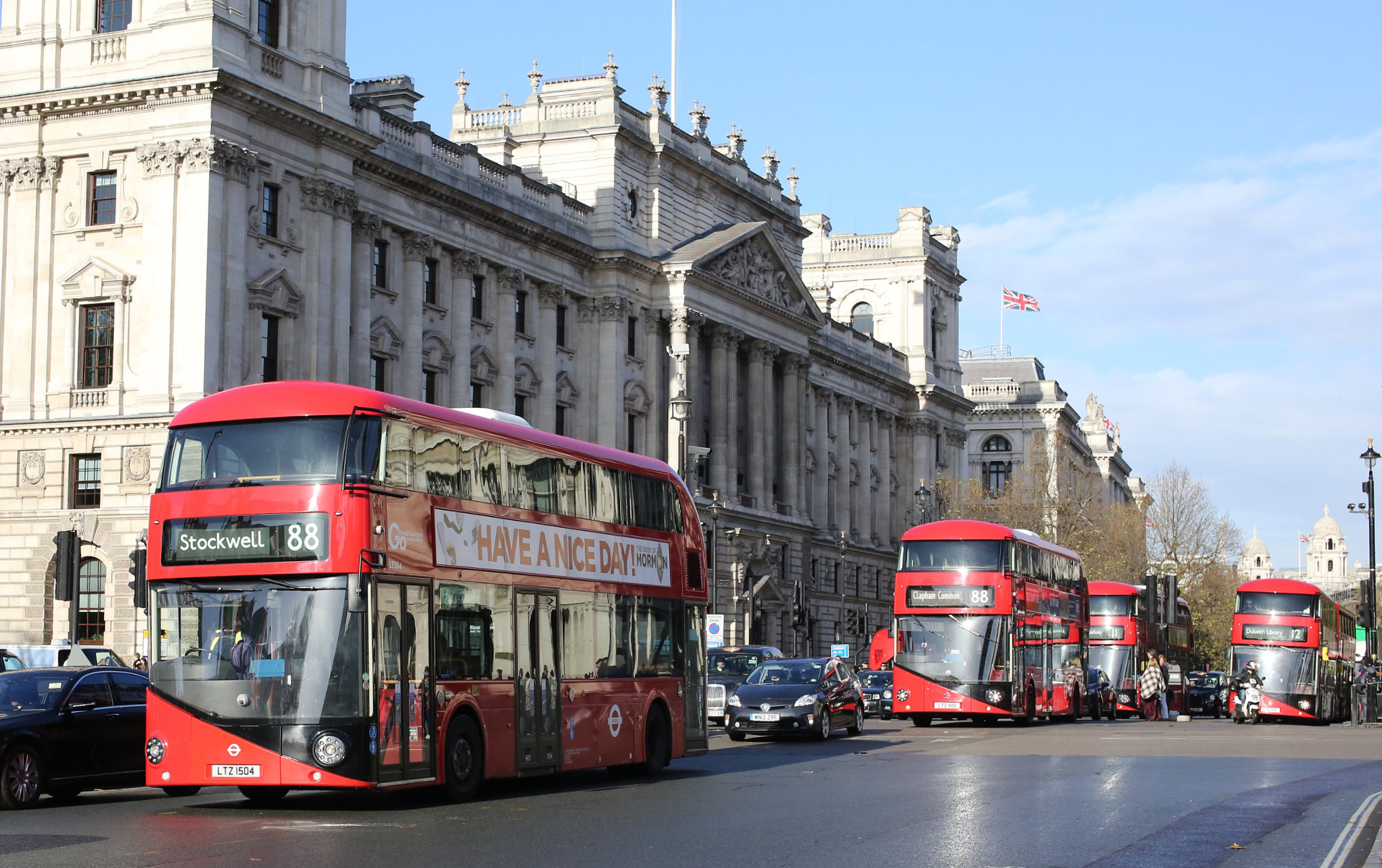 A flock of ‘New Routemaster’ buses on Parliament Square and Whitehall. Forming the new LT class they entered service in 2012. They are nicknamed ‘Borismasters’ after Boris Johnson who was the London Mayor who oversaw their introduction…
