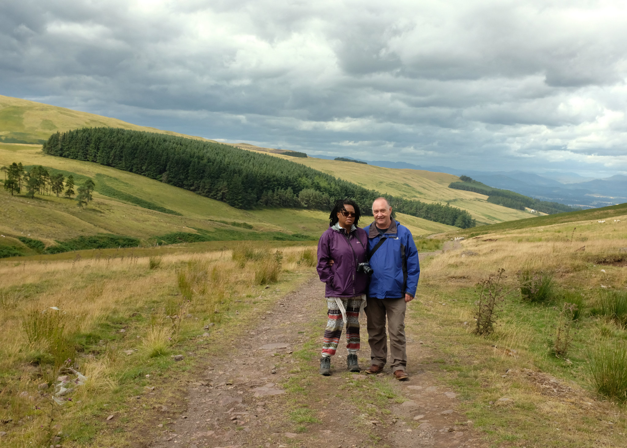 My ‘Sporadic’ post dropped a hint that there would be a bit of a break in my blogging. I can now reveal that I’ve been on Holiday for two weeks with my Wife and Son. Although I was able to make three posts in the first week that I was away using the scheduled publication feature of WordPress, I wasn’t in a position to add more posts afterwards or to respond to any comments. We went to Scotland and stayed near Auchterarder in Perthshire on the northern slopes of the Ochil Hills beside Gleneagles. Here’s a photo of Epi and I taken by Alasdair as we walked in the Ochil Hills on a windy / cloudy day…