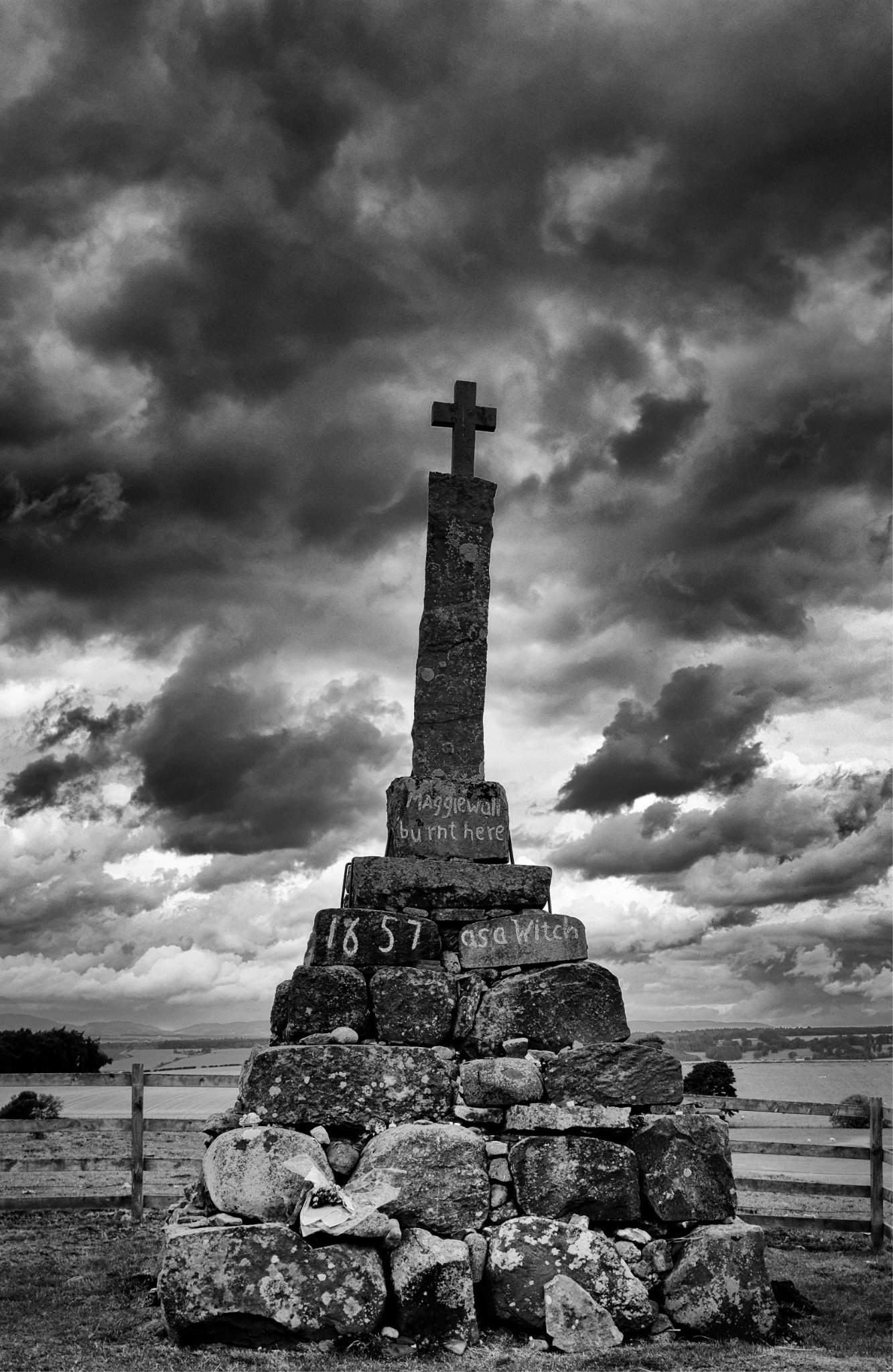 Witches are sometimes recalled in local memory through the names of wells or caves where they reputedly practised their arts. Uniquely, Maggie Wall has a monument located beside the B8062 close to Dunning in Perthshire. The monument carries the daubed inscription ‘Maggie Wall burnt here 1657 as a Witch’. Some people clearly come here in the knowledge of what the memorial represents – there are many small tokens left as offerings on the cairn below the cross. Reputedly, a wreath is left here to Maggie on occasion. Someone certainly repaints the inscription regularly. Unlike these ‘pilgrims’ I just stumbled upon the site on my way past and in the assumption that it marked a battle from Scotland’s history came back to take a look. What I found was a mystery!