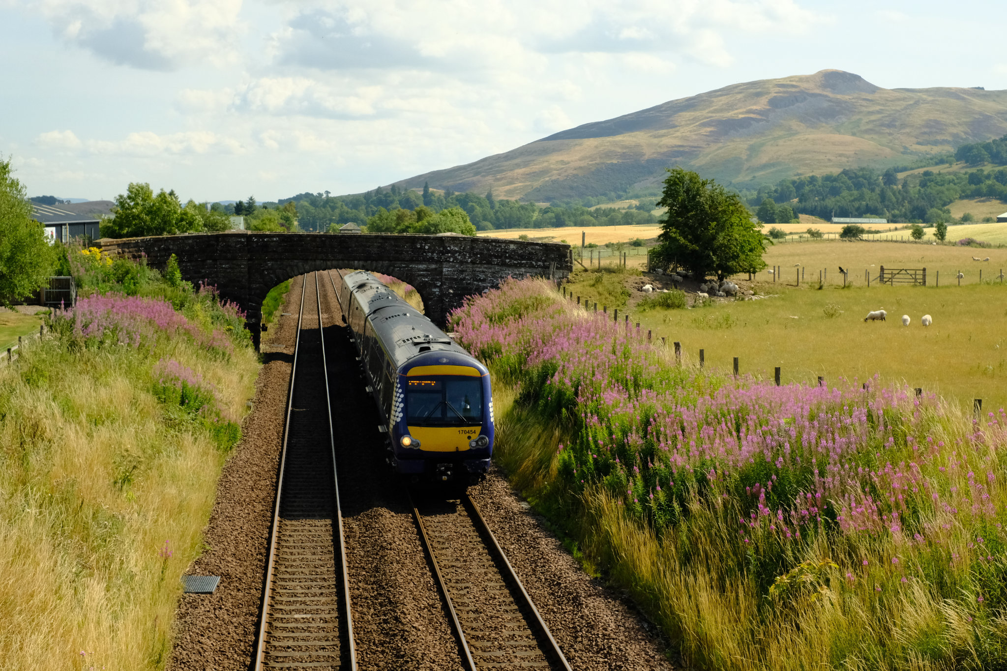 …This is the 1T98 service from Inverness to Glasgow Queen Street and is formed of a Class 170 diesel unit (170454). The Rosebay Willowherb makes a fine display on the sides of the cutting and Craig Rossie stands proud on the horizon.