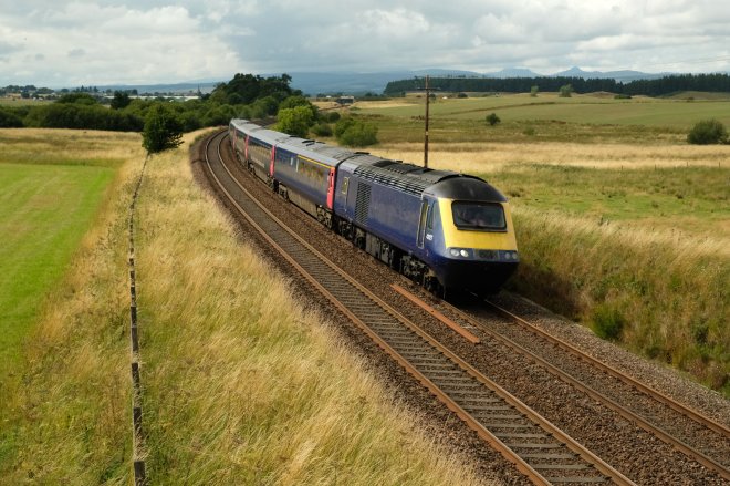 …Not in the passenger timetable and still wearing her old livery without operator name, this is an example of the HST’s that will replace the Class 170’s on services from Edinburgh and Glasgow to Stirling, Perth, Dundee, Aberdeen and Inverness. They have been released from First Great Western services on the London to South Wales and Bristol routes. Recently re-engineered, they will be fully refurbished for their new role and will operate in 4 and 5 car sets. Despite being over 40 years old I think they will bring improved standards of comfort for passengers.