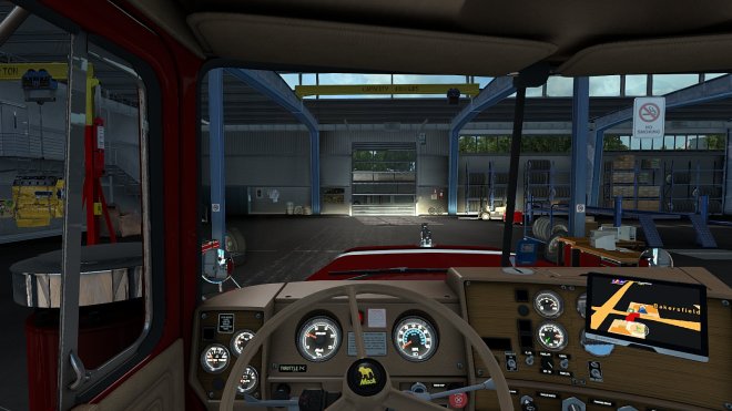A couple of weeks ago I finally convinced him to try again only this time he would be driving on my profile in a truck that is smaller and more suited to getting a basic idea of what it’s like to drive a real world car. For this exercise I sat him ‘metaphorically’ in the Mack R600. He’s two years older and a bit wiser so this time he was open to my ‘driving instruction’ 🙂 The cab of the Mack is not dissimilar to the car I learnt on. The main difference is the rev counter on the left of the central display…
