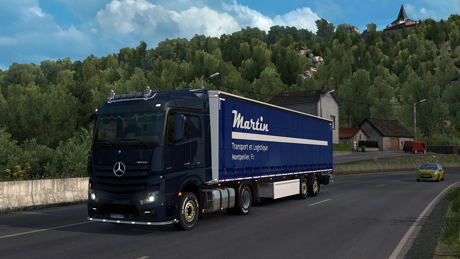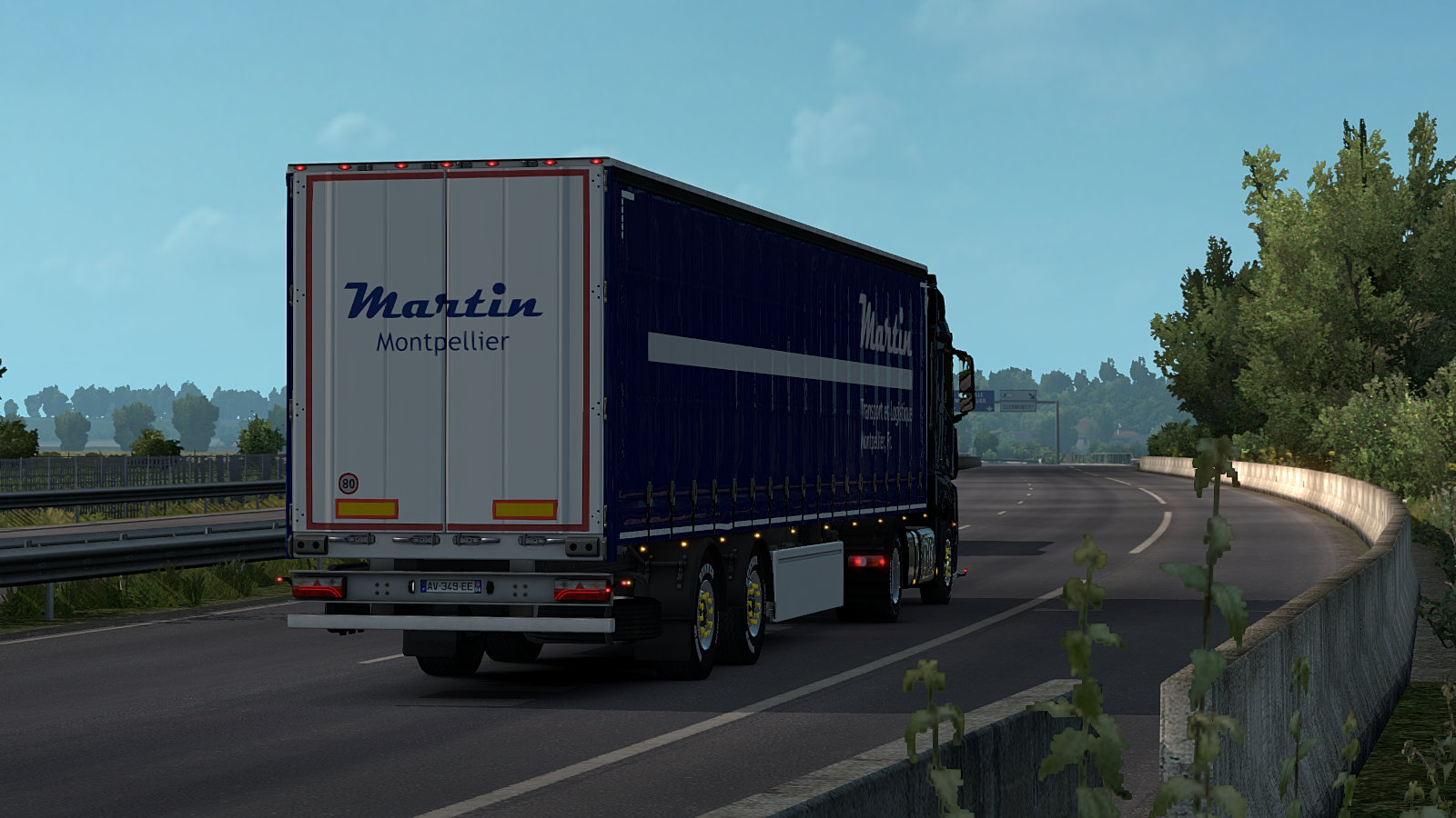 Back to ETS2 and something special. One of the key changes is that we can now own trailers. That opens the door to us having our own virtual trucking companies 🙂 In turn, that means that we can design our own virtual trucking company paintjobs for our new owned trailers. It’s not easy – at least for a skinning novice like me! It’s taken nearly 4 days to create it and then get it to work in game. Big thanks to RedneckRam and JohnnyBoy99 for video demonstration and sample code 🙂 Here is the new Martin Transport et Logistique trailer seen on the run south from Clermont Ferrand to our home in Montpellier…