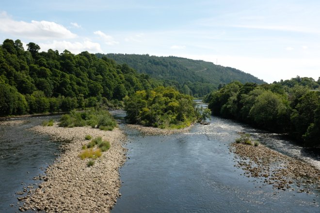 Looking downstream from Dunkeld Bridge. More of the stones forming the rapids at this point are showing above the water than normal after an extended period of dry weather…
