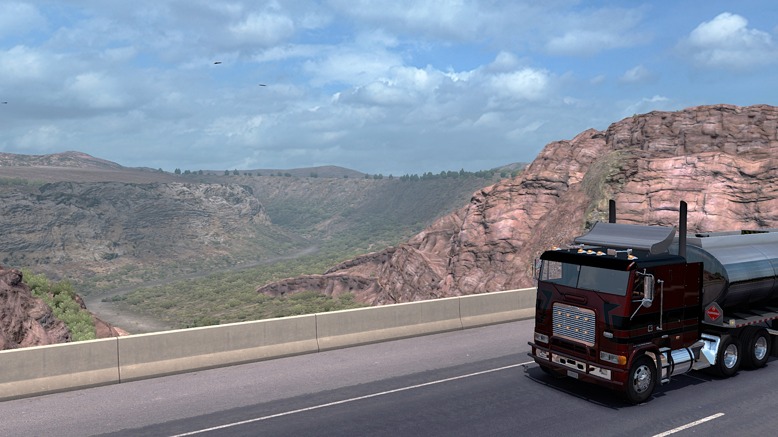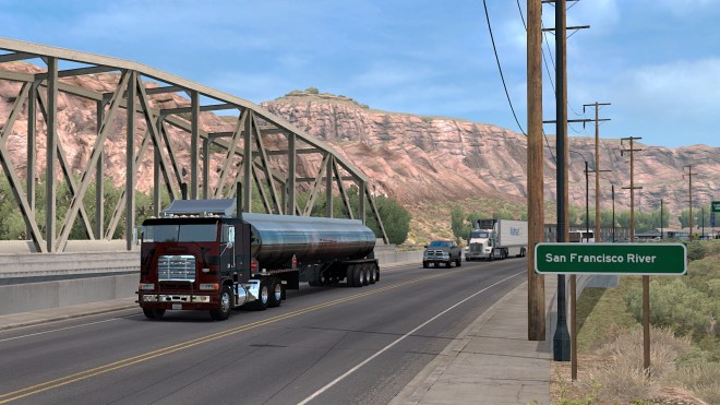 In ATS there are new roads still to explore and old roads that have changed. The map seems to undergo little tweaks with every release. I arrived in Flagstaff after the 1.32 release to find there are now traffic lights at the western end of the town which weren’t there before! The Arizona map now has a section of the 191 highway up through Clifton so I took the opportunity to explore that with a fuel delivery to Clifton. Here’s the SCS representation of the Gila River crossing…