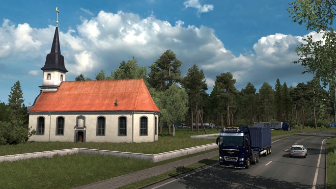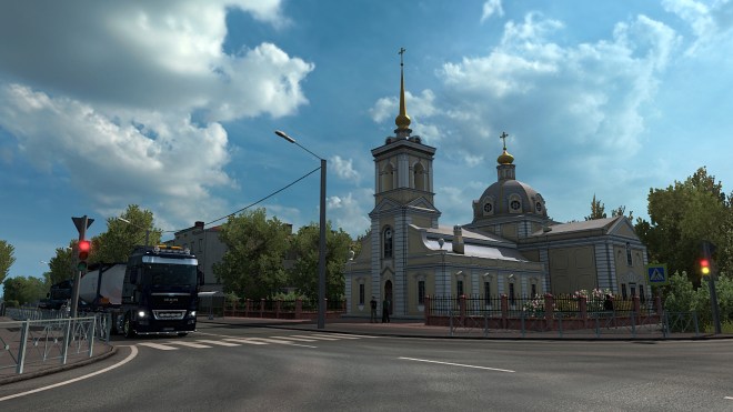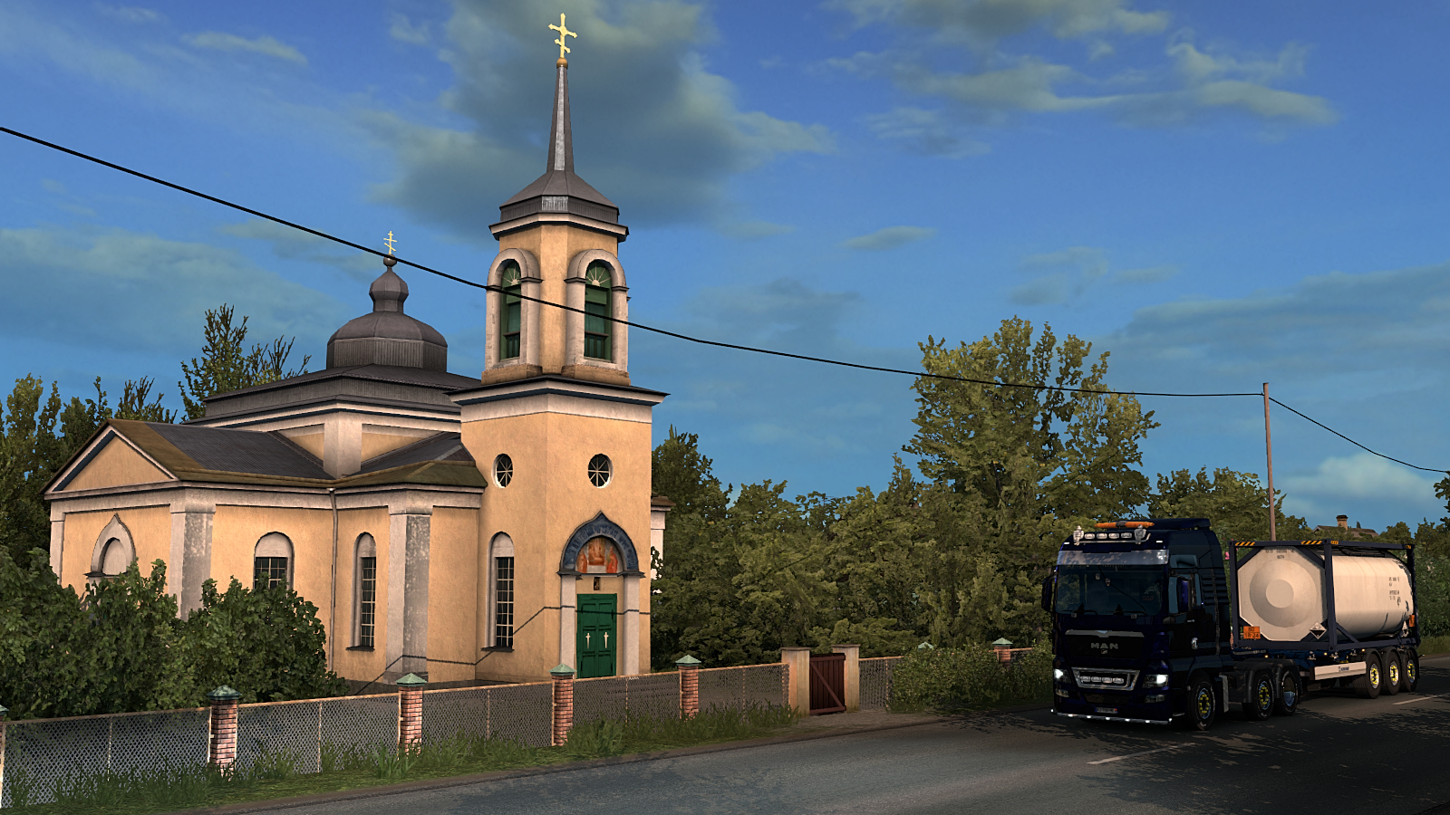 The MAN proved to be an excellent choice for the trip because… The roads have some very weird speed limits and loads of junctions to negotiate. It’s fair to say that in the Baltics as represented in Euro Truck, the motorway system is in its infancy. So having the 540HP of the MAN was very helpful with keeping time on urgent jobs – she can fly when she wants 🙂 I’ll return to the subject of keeping time in a while. What I must say about this Baltic expansion is that it captures the essence of what I expect the Baltic states to be like based on what we see on the news or on travelogues. What makes it even better is when fellow truckers that live there praise the implementation – so hats off to the map creators at SCS for their work 🙂 Churches are a theme with ones of the orthodox Christian faith prevalent…