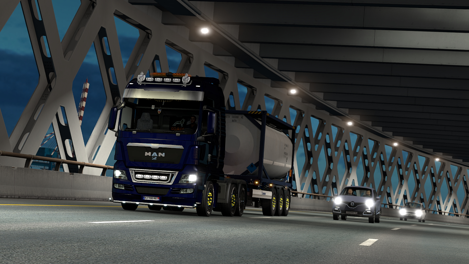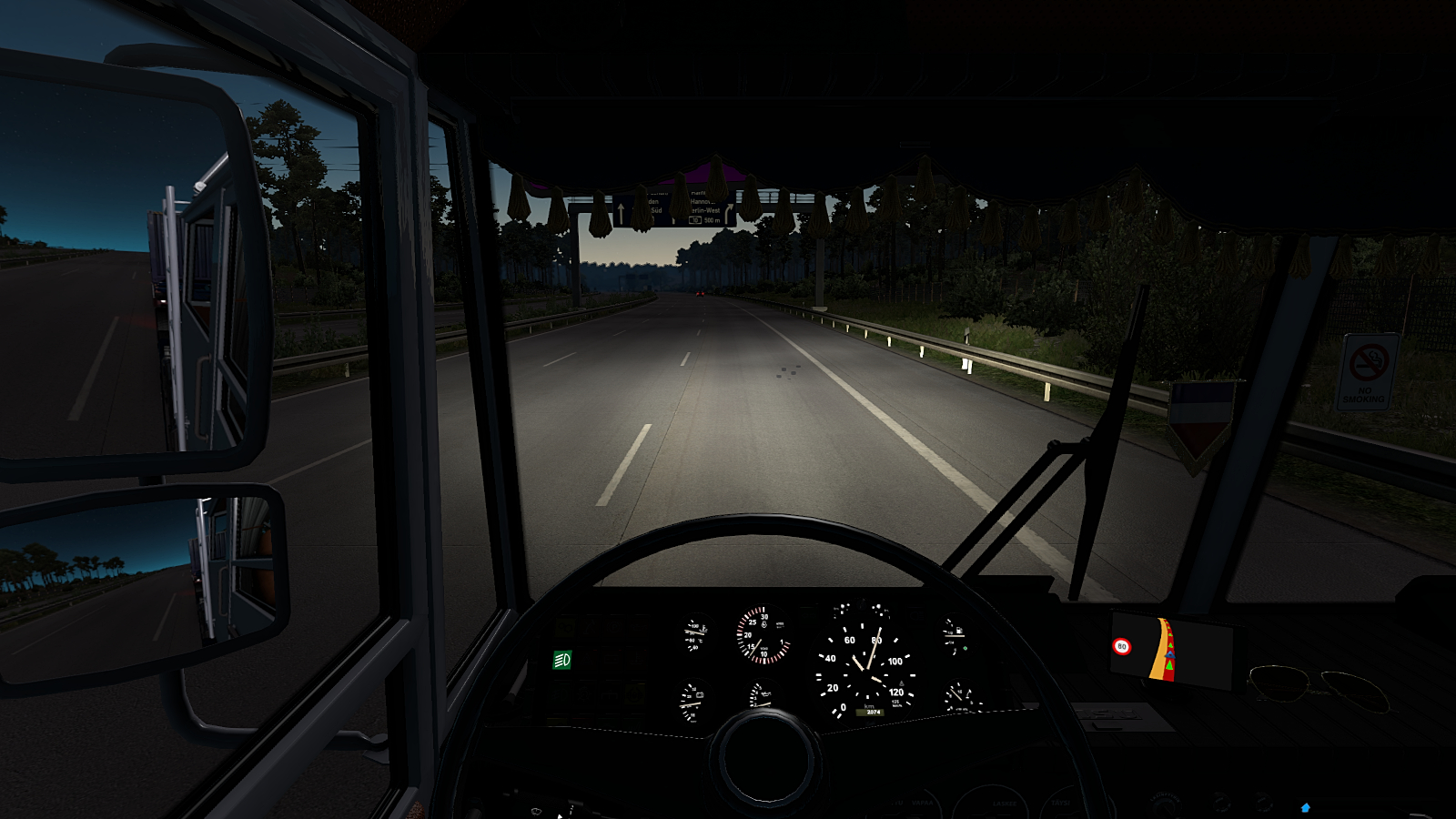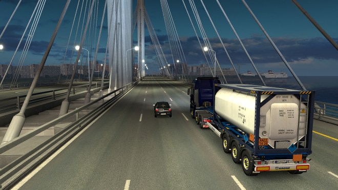 …The engine sounds are very different from modern engines – in some ways this was a real revelation compared with the old Volvo’s and Scania’s that I’ve used before in Euro Truck. The generally deeper note of the engine was there as expected and so was the heavy deceleration when I removed my foot from the gas. But this seemed very lacking in power. In fairness, I suspect that it wasn’t designed for hauling 21t but then neither was the Volvo F88. I found myself having to keep my foot in for ages as the truck wound up speed and as fast as we gained speed we hit another restriction or junction. This was trucking in the raw and fighting against the implacability of a deadline. The one positive was the retarder which also summoned the engine brake – a godsend – we could slow down far faster than we could accelerate! Here’s a nice night shot of us passing through Malta (not the island)…