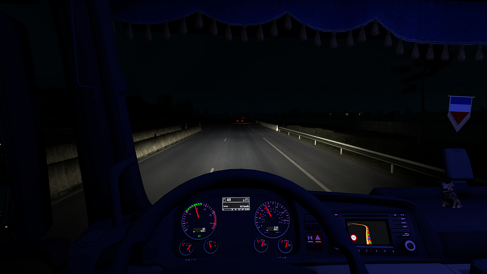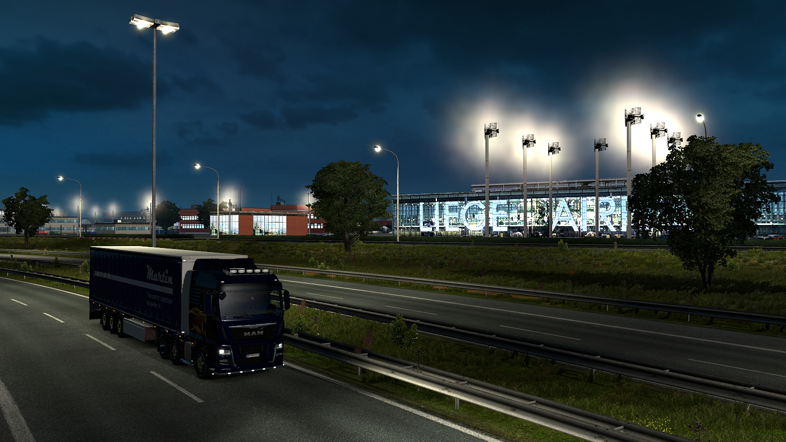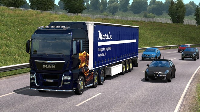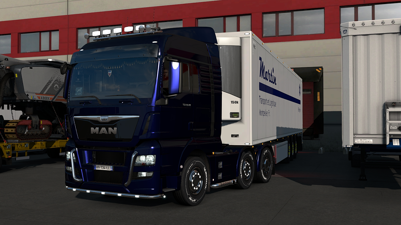 The 440HP spec performed adequately and I think Martin Transport et Logistique will be rolling these out across the fleet to replace the Merc’s and the Euro5 MAN trucks. However, I will also be using Scania R450 series trucks at some depots. When suitable trailers become available I’ll take a look at the MAN 8×4 truck with the 640HP engine as an option for our heavy-haul division alongside the Scania R580 and R730 or S730. But for now it’s normal hauling that is the focus. I’ve played around with the spec of the truck since the 440HP test. I’ve applied a special livery celebrating 100 years of MAN Bus and Truck and added a blue interior light – I find it enhances the visibility of the gauges at night (My Scania Streamline R580 also has blue interior lighting). And she’s back to the 520HP D38 engine. Here’s some shots of the new livery taken during a run from Montpellier to KΓΆln…