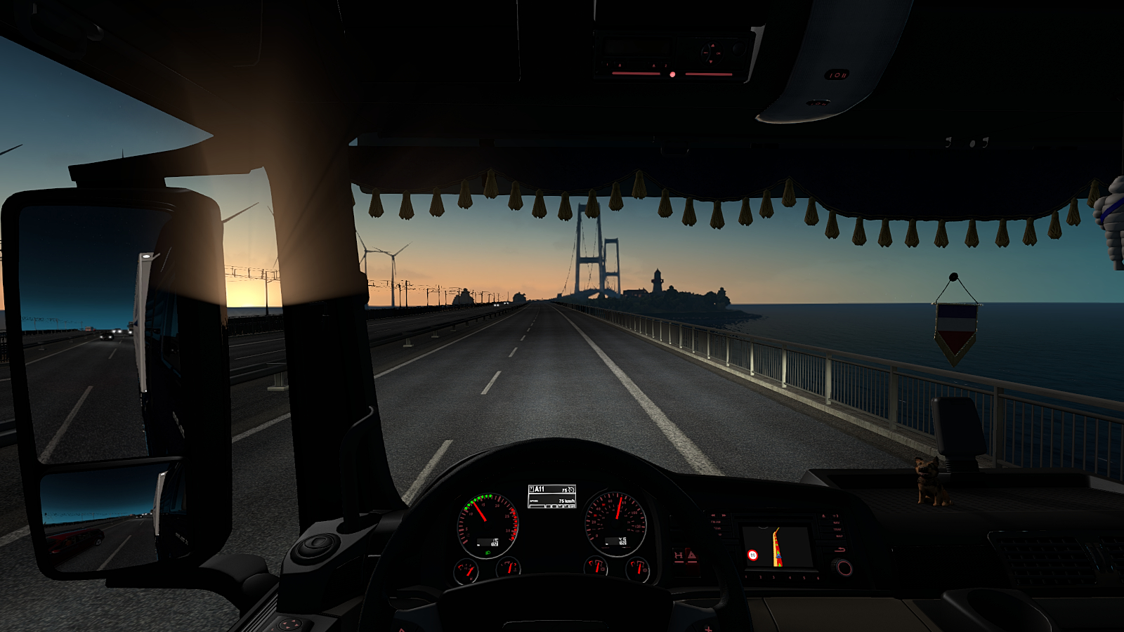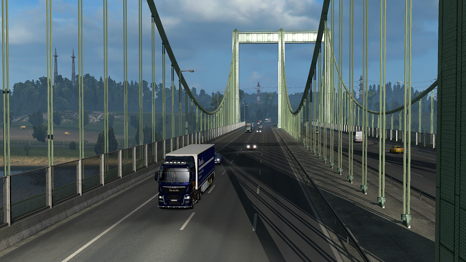 So the driving in the past week has all been in Euro Truck, trying out some different configurations. What do I think of the new version of the TGX? It’s ok – a little bit underwhelming when compared with the latest Scania R and S series trucks that were released last year. It seems to be a generation behind compared to them. I think that is because it’s been ready to go for at least 2 years but has been mired in Licensing issues. That said, the interior is excellent with the dash very nicely reproduced. The engine sounds are definitely better than those in the Euro5 TGX that we’ve had since the start. There’s a very clear difference in sound between the D26 and D38 series engines. However I did note a discrepancy in the D38 engine ratings compared with those in the current MAN range. The current brochure gives a range in logical steps of 540, 580 and 640HP but what we get in game is 520, 560 and 640HP. This is almost certainly a result of the licensing delay as those engine ratings would have been correct back in 2014 when the D38 series was first announced. Looks like a job for an enterprising modder to provide the current options π I initially tried out the 520HP engine before spec’ing the truck in one of the commonest configurations you see in the UK – 6×2/4 midlift chassis with the 440HP D26 engine. Here she is with one of our reefers about to set off from Frankfurt with a load of Smoked Sprats for delivery to KΓΈbenhavn…