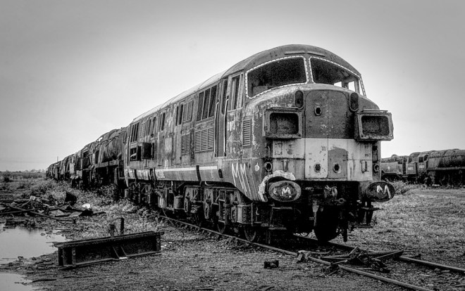 For Cee’s Challenge this week I’m going with a shot taken in Barry Scrapyard. The shot is of D601 Ark Royal awaiting the cutters torch surrounded by steam locomotives. Barry was where many locomotives came to meet their doom at the end of steam and some early diesel locomotives ended up there too. Woodham Brothers had a policy of not scrapping locomotives until they had run out of other items to cut up for reuse. Many of the steam locomotives we see on preserved railways today came from Barry scrapyard (which is why there is a bit of a predominance of GWR types).