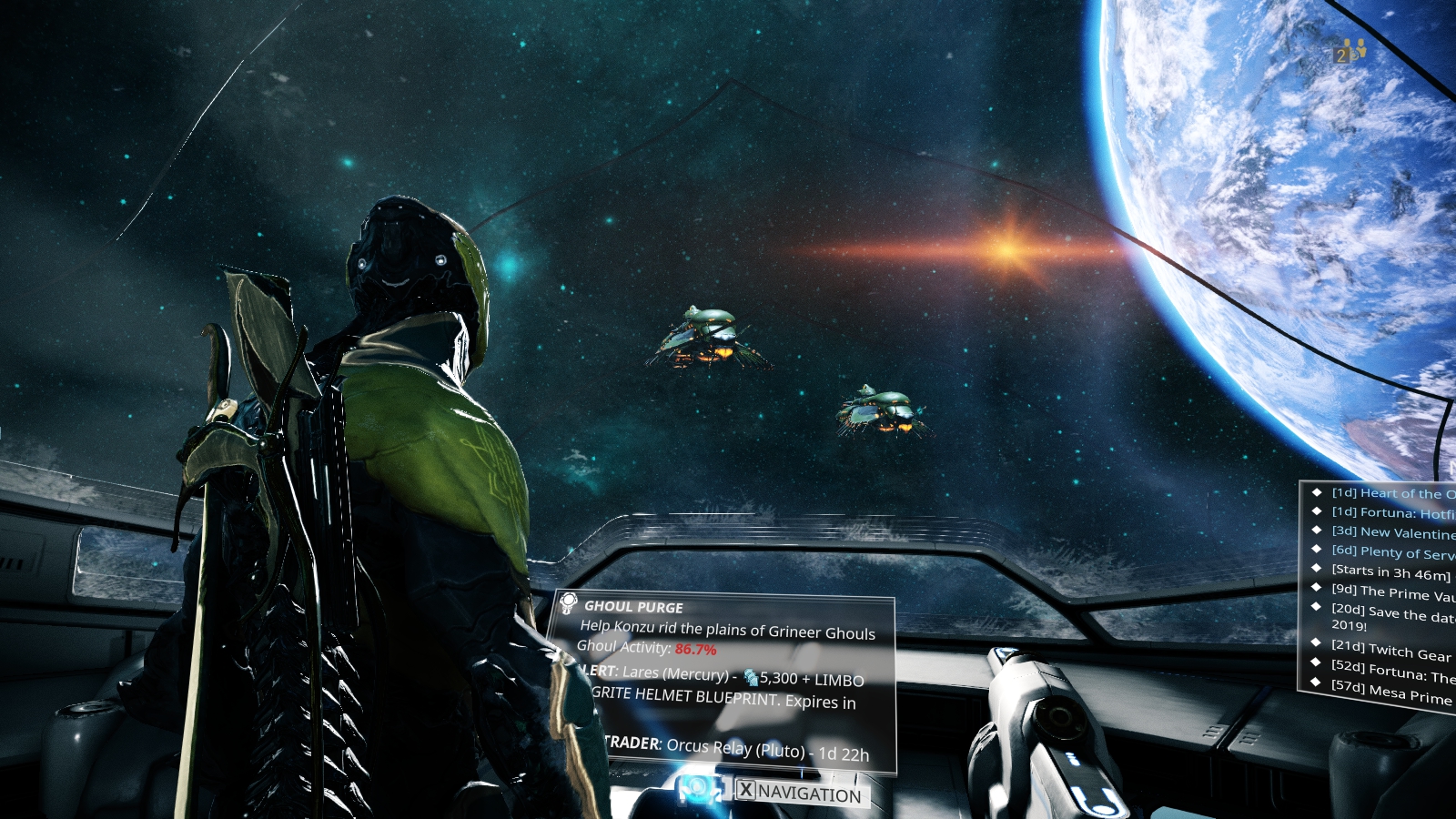 This is the view out of the window of my ship somewhere above Earth with two Grineer vessels…