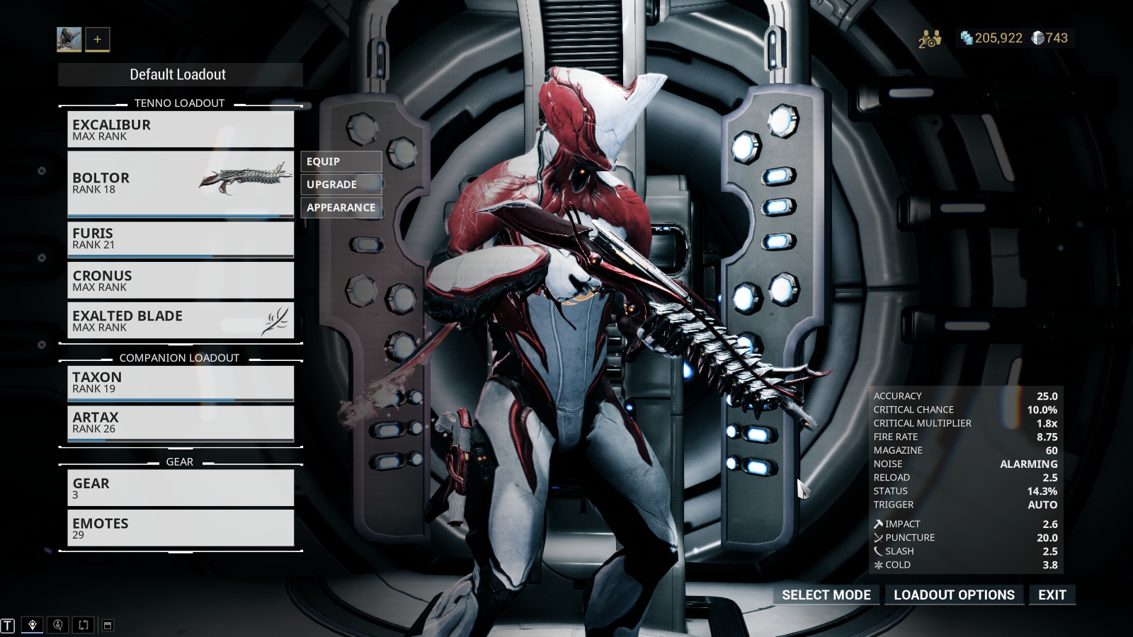 …You’ll note that I can change the colours of my Warframe. Unfortunately, the ship is just a home between missions – you don’t get to fly it. In the first missions of the game you get to choose a main and secondary weapon along with a melee weapon. As you progress in the game more weapons become available. I’ve moved on a bit so here you see me in the ship’s armoury with the Boltor which is currently one of my favourite primary weapons…
