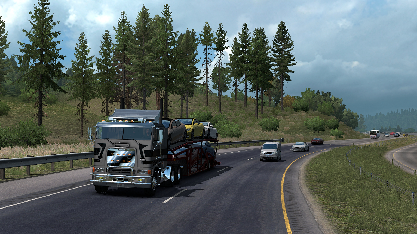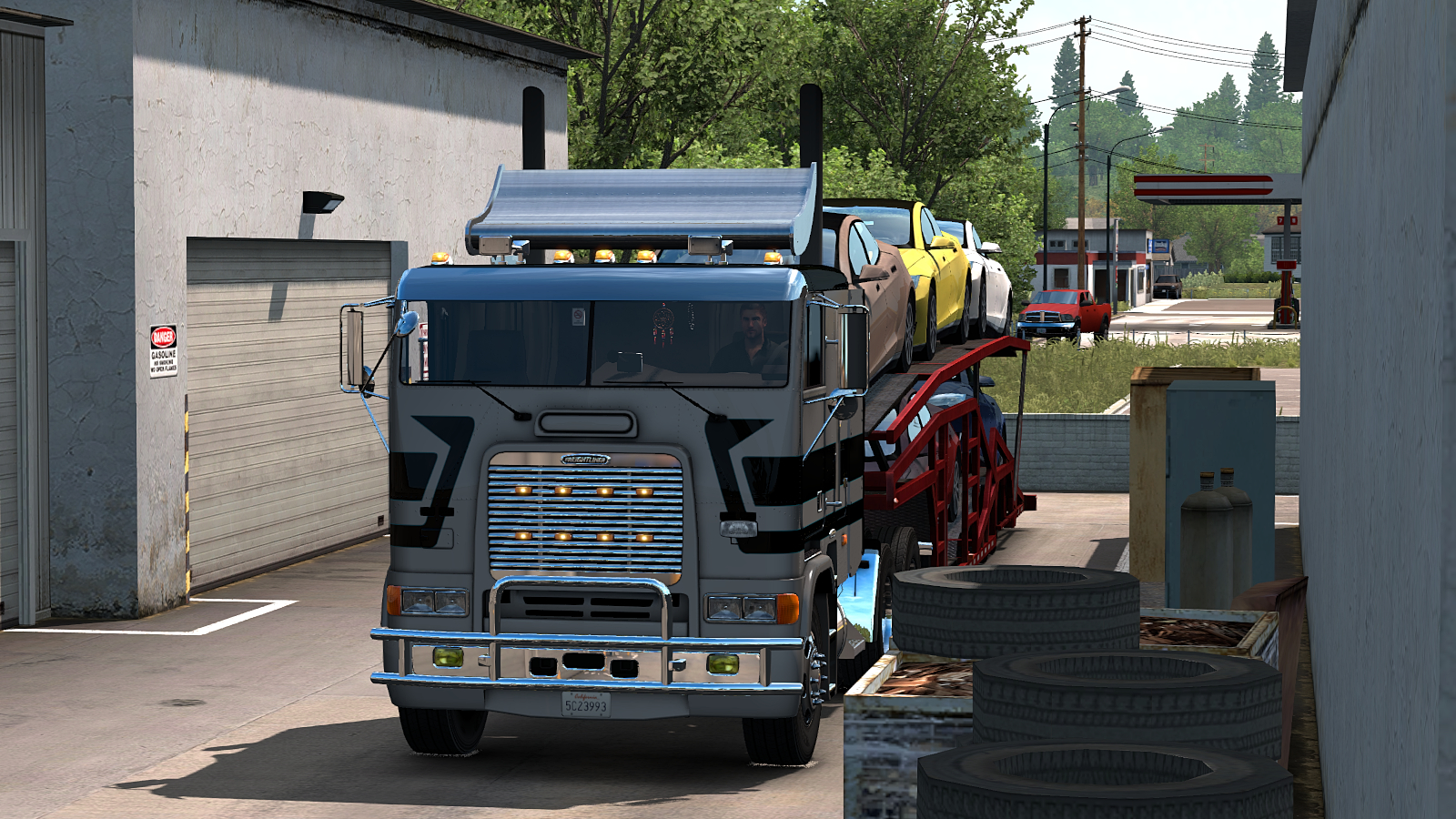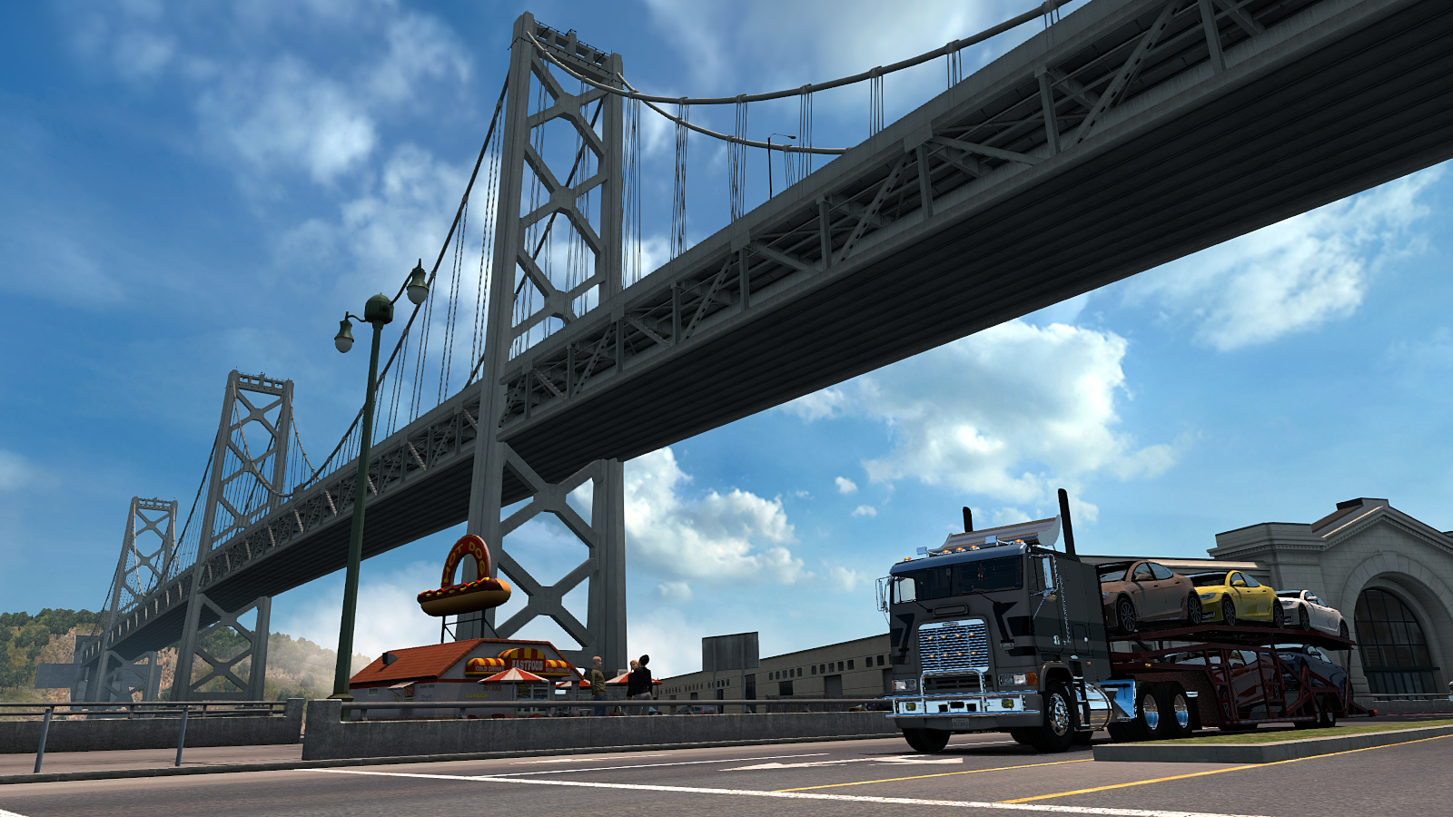 In American Truck I’ve been doing a little old school trucking in the Freightliner FLB. Here she is on a run from Santa Cruz (CA) to Newport (OR), passing through San Francisco on the way, with a light load of new cars…