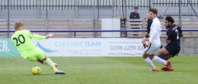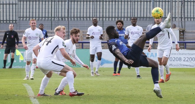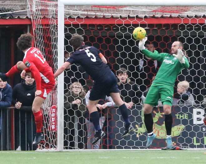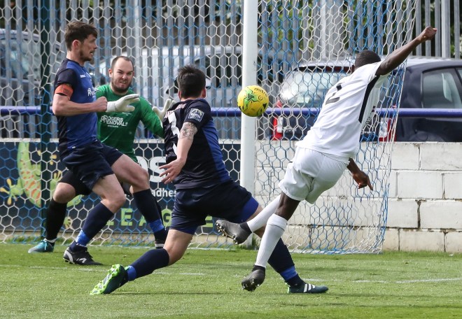 April didn’t start well with a chilly visit to high flying Carshalton Athletic – they would finish second in the league. After holding our own for the first 30 minutes we succumbed big time and lost 5-1. Even Gorey couldn’t stop this shot…