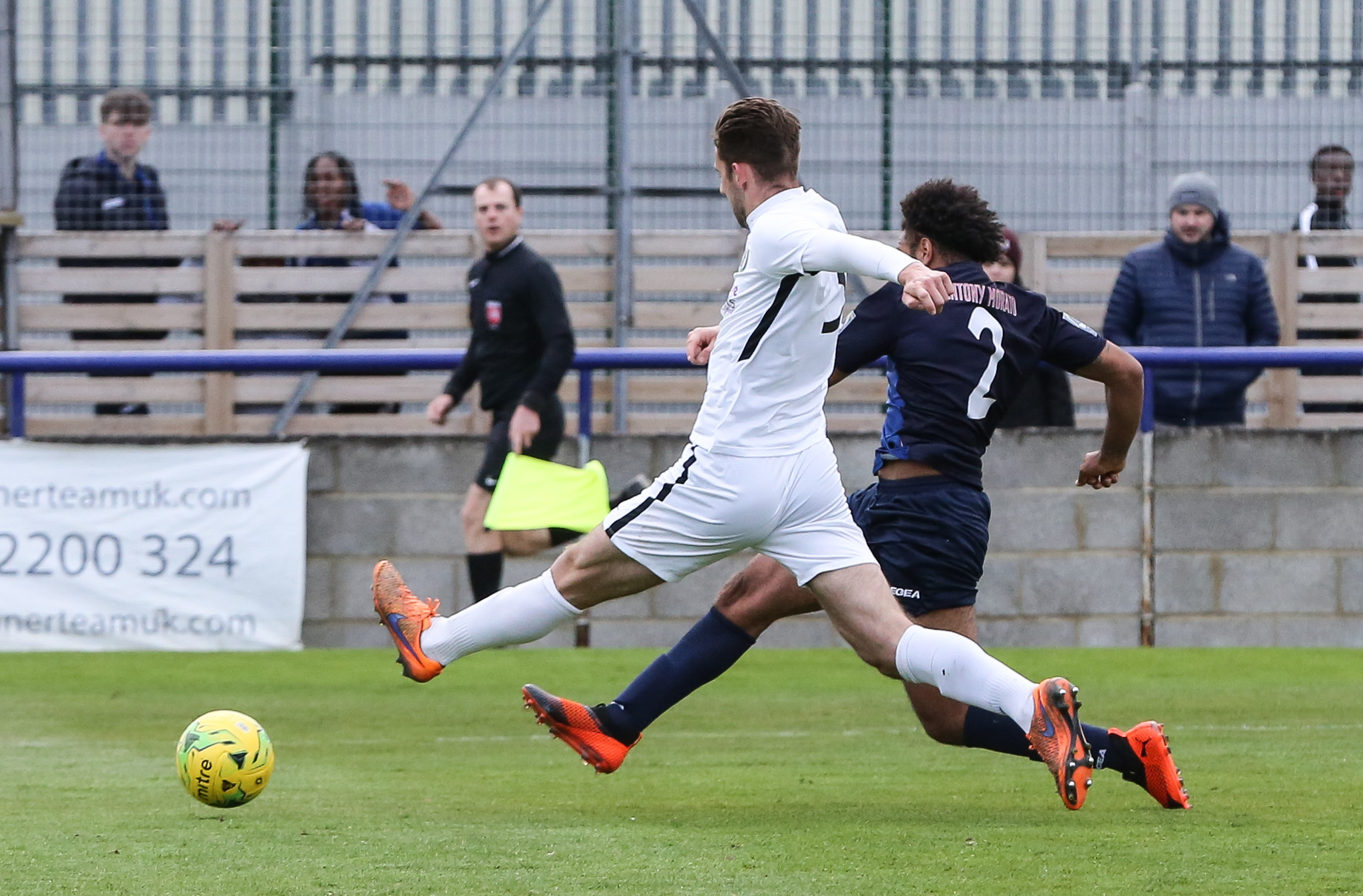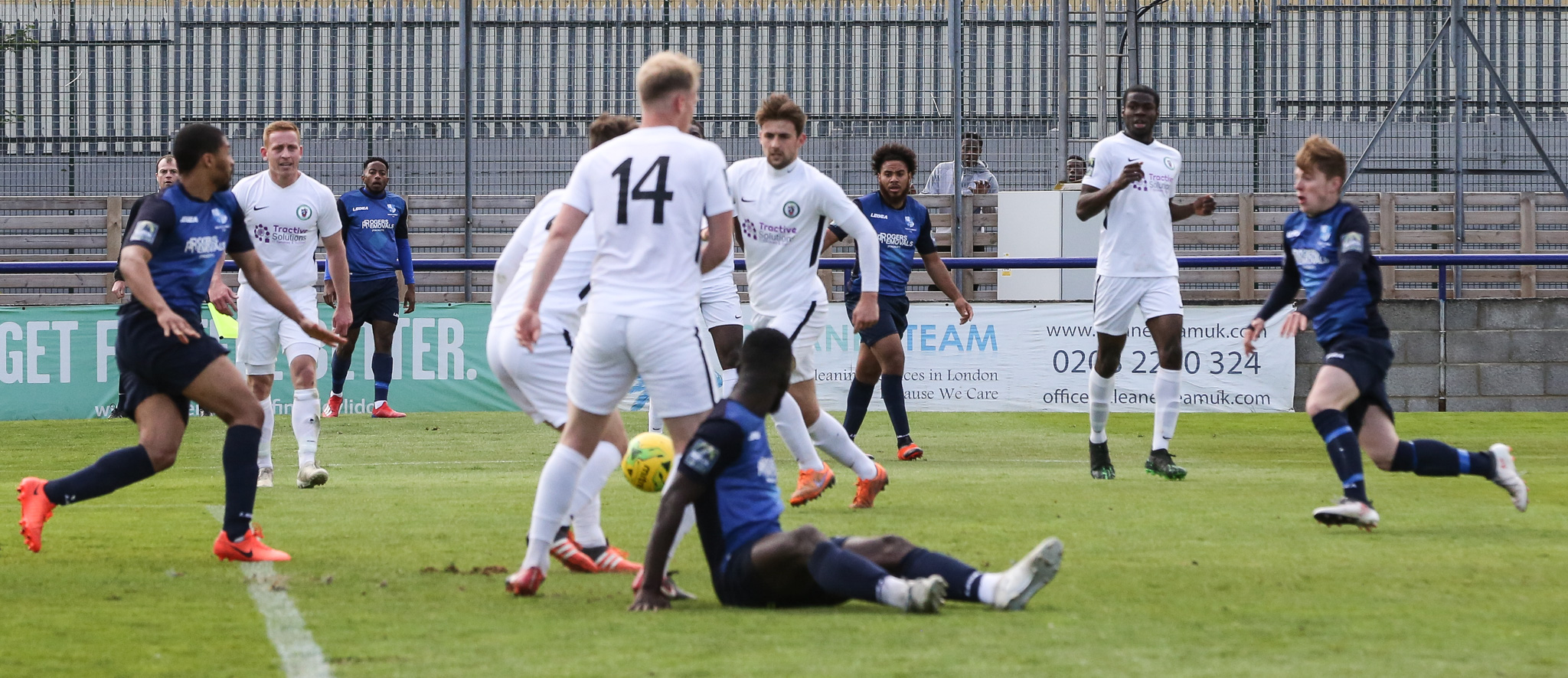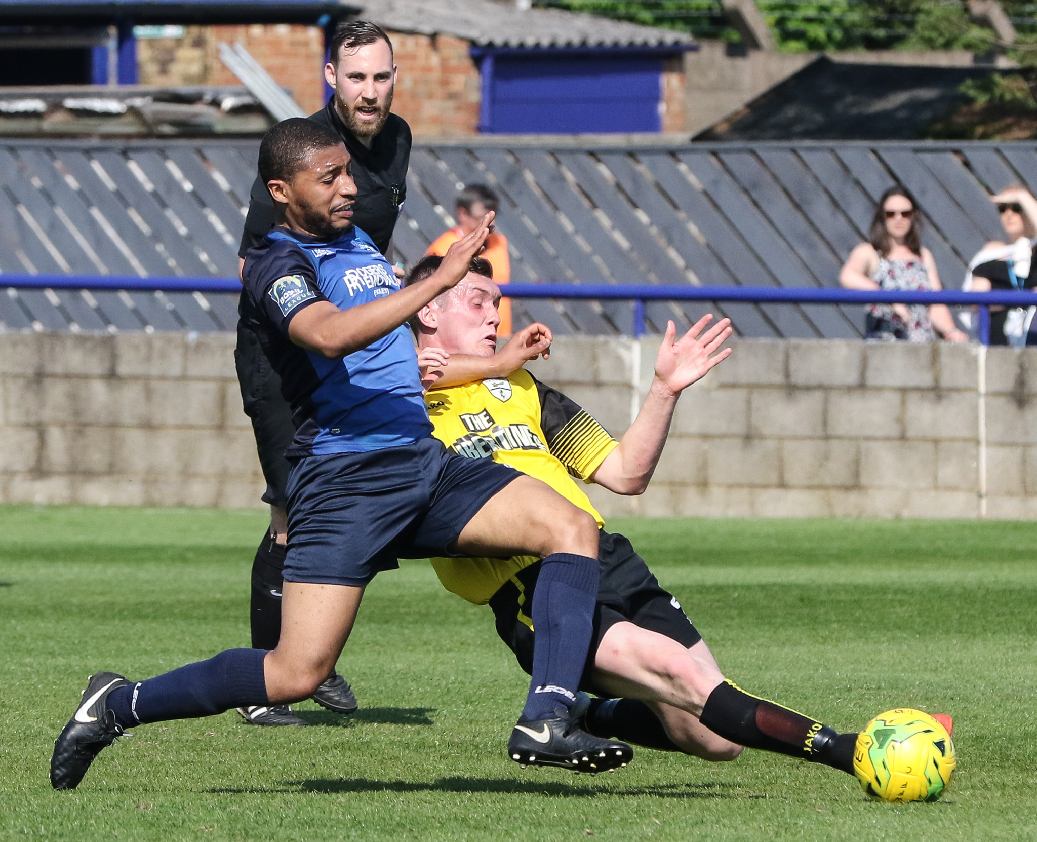 Easter weekend is always a big one for non-league clubs with two games over the weekend and the Bank Holiday Monday games usually being local derby matches. Burgess Hill played their first fixture on Good Friday and were beaten 2-0 by Carshalton. On Saturday we faced Margate at home. Mid-table Margate had little to play for and for most of the match the game looked set for a draw. Then the referee stepped in and twisted the rules of football in what we have to assume was some sort of brain-storm. He played an advantage allowing Margate to make an attack and have a shot on goal. That should have been the end of it but, having allowed Margate to complete their attack, he inexplicably called play back to give a free kick at the site of the original infringement. Margate scored from the free kick. It’s refereeing decisions like this that can cost clubs their league status and a lot of income. He apologised for his mistake in the boardroom after the game but apologies don’t restore lost points 😦 Here’s Tanashe challenging for the ball with a Margate defender while the referee looks on…