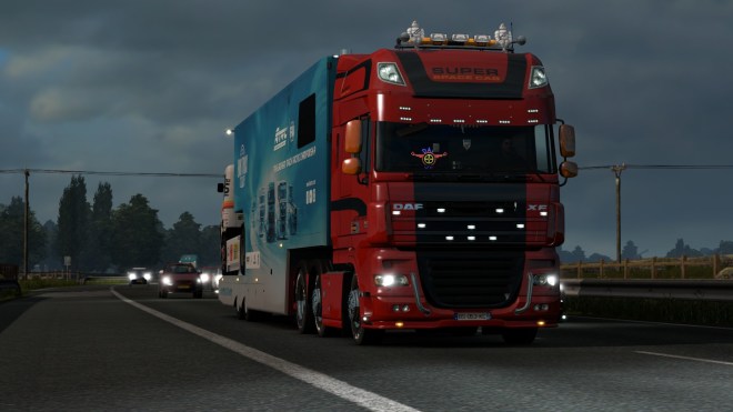 I have shown some images from this event in a couple of recent posts but I thought I’d close out with a couple more screenshots to illustrate how game changes can result in changes of heart regards certain trucks. I’ve written before about not really liking DAF trucks very much. These vehicles have had a bit of a makeover in the last year or so and have also received their own tuning pack. During the event I thought I’d give one of these a try once again as part of my effort to add variety to my event related tweets. I opted for the XF 105 which has the older style cab and I fitted the 510HP PACCAR engine. There is a special paint scheme for the Space Cab version and I gave that a racy-red base colour. The biggest issue for me remains the design of the instrument cluster but I gritted my teeth and set out on the road…