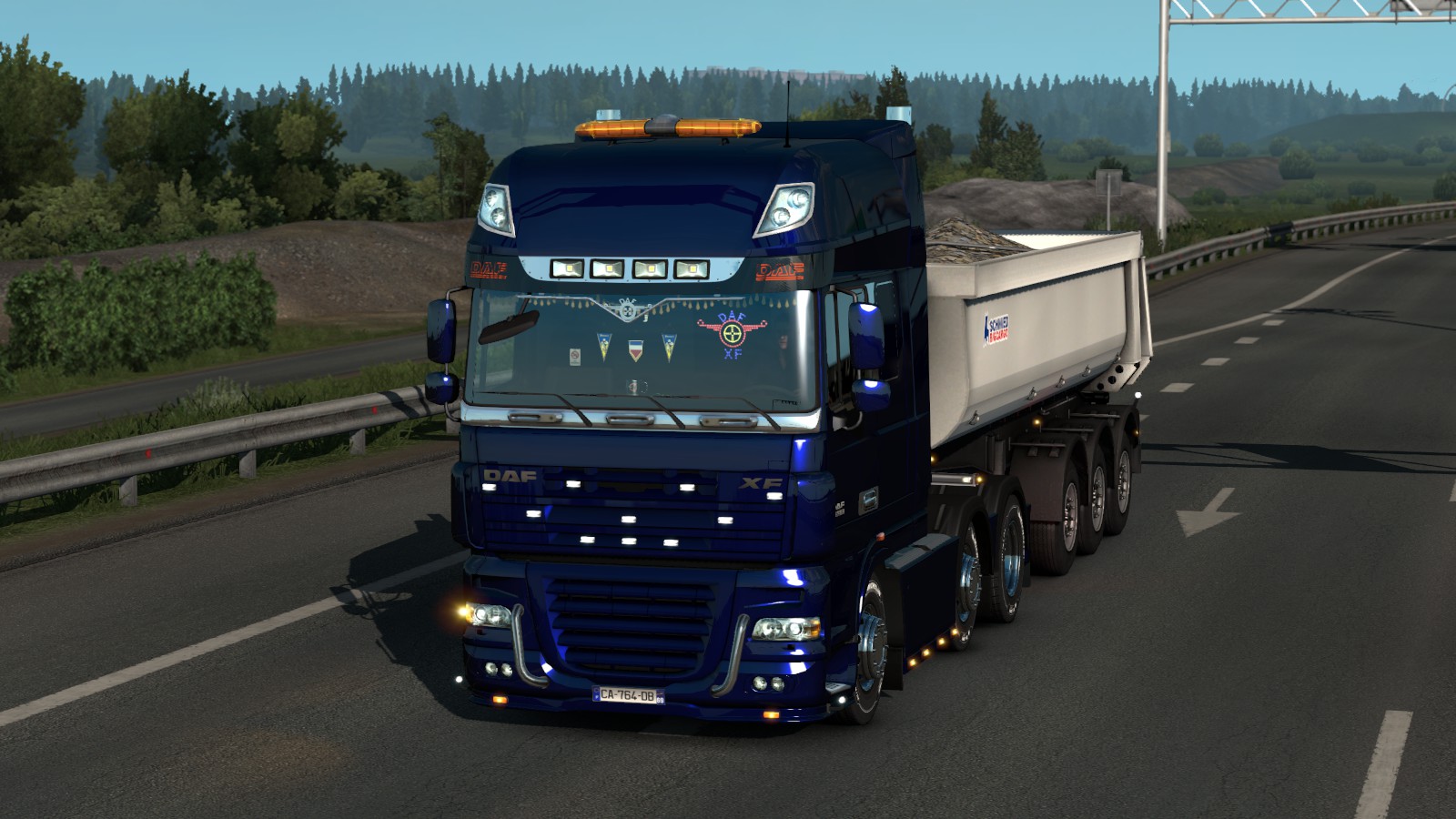 Several runs later and I had decided to keep the DAF XF 105 (I think the improvements made by the rework of DAF trucks combined with my upgraded monitor may have helped). So, it was back to the workshop for a repaint and some other cosmetic changes to bring her into line with company policy but retain her Gaffer’s Truck status. This is what she looks like now…