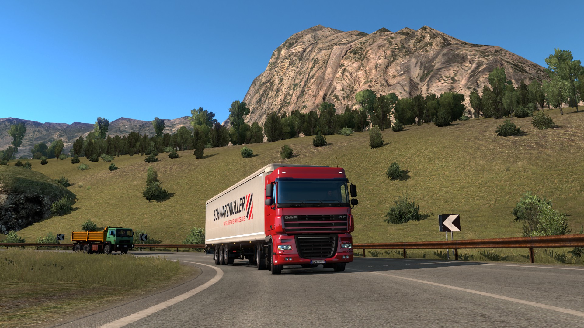 Another change that I was eager to try was the ownership of Schwarzmüller trailers. I believe this was one of the first trailer manufacturers to come on board with SCS and allow their trailers to be accurately portrayed in the game so it’s good to be able to buy them for our companies. Yesterday I reached the point where I had the money to buy their curtainside trailer for my testing. Here is the DAF XF and Schwarzmüller trailer combo sitting outside my basic garage in Montpellier…