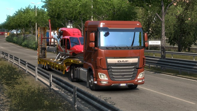 The other different ‘policy’ I pursued was in the way that I allocated the skill points as they became available. Initially I added 2 each to Long Distance, High Value Cargo and Fragile Cargo. The next 4 levels went on High Value and Fragile. The effect of not adding to the Long Distance was to limit my jobs to tasks that could be completed in a single driving shift, whilst the other categories added to the available rewards when at cities where machinery or tech equipment loads were available. So here we are descending the Lahn valley near Koblenz with a wind turbine nascelle…