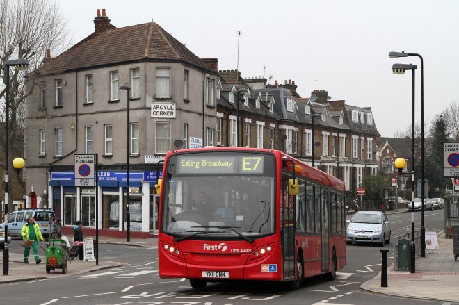 Letters and Numbers are often combined in London for bus routes in a certain area. This E7, for example, is a route in the Ealing area…