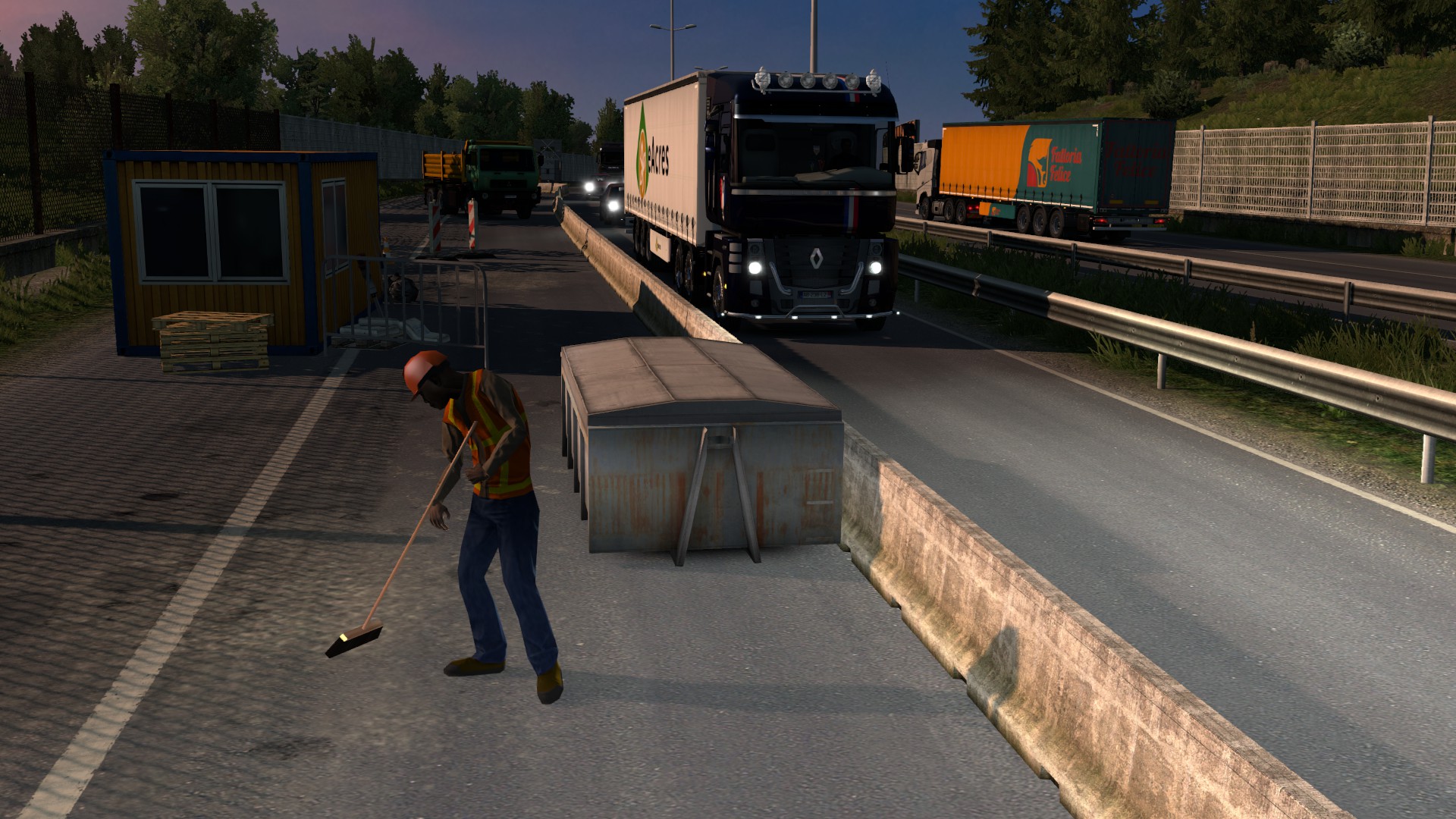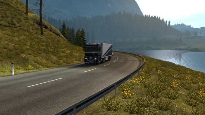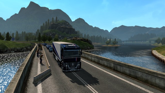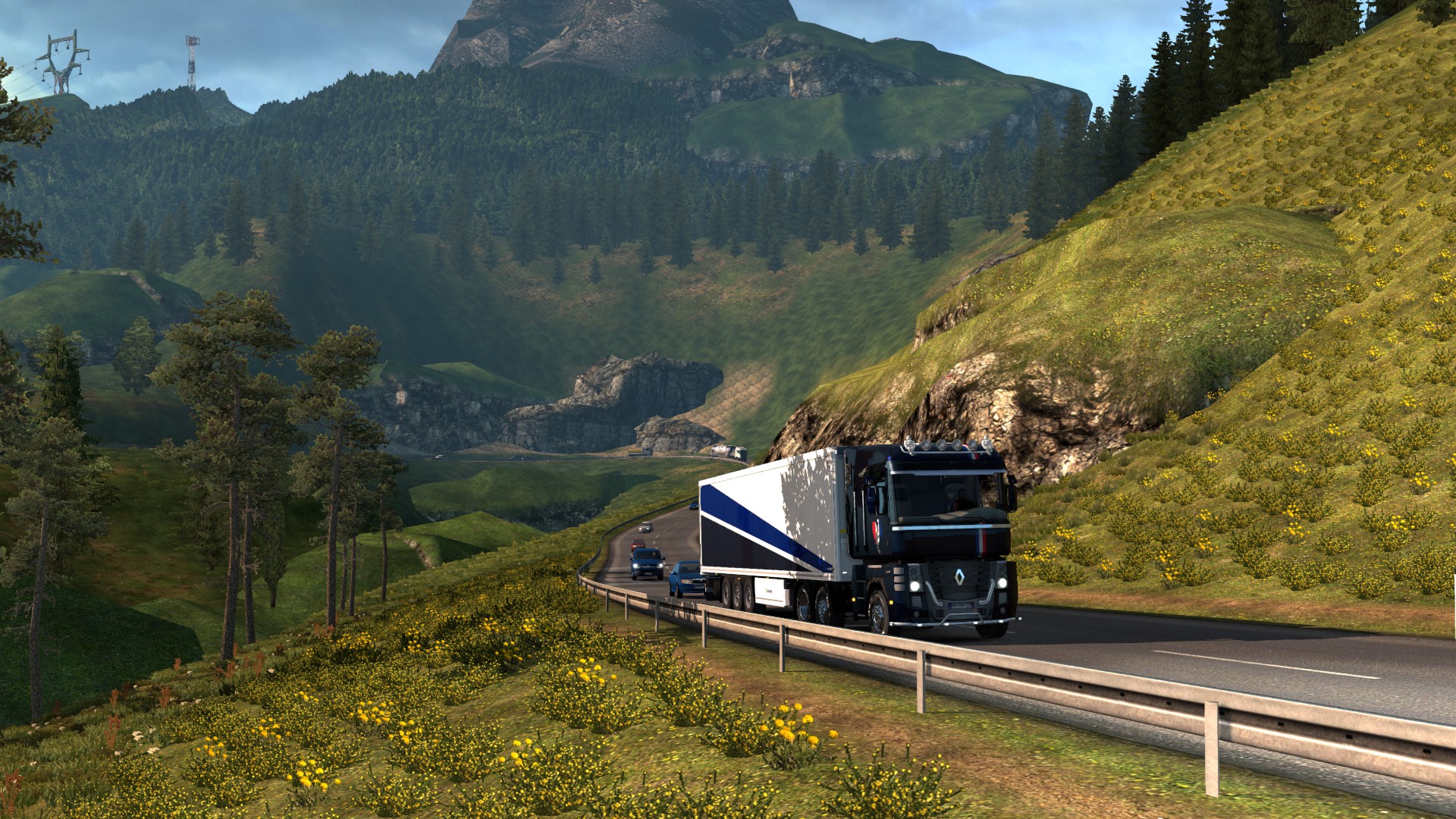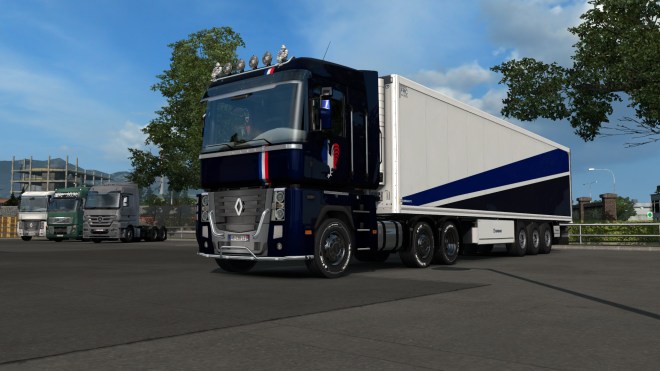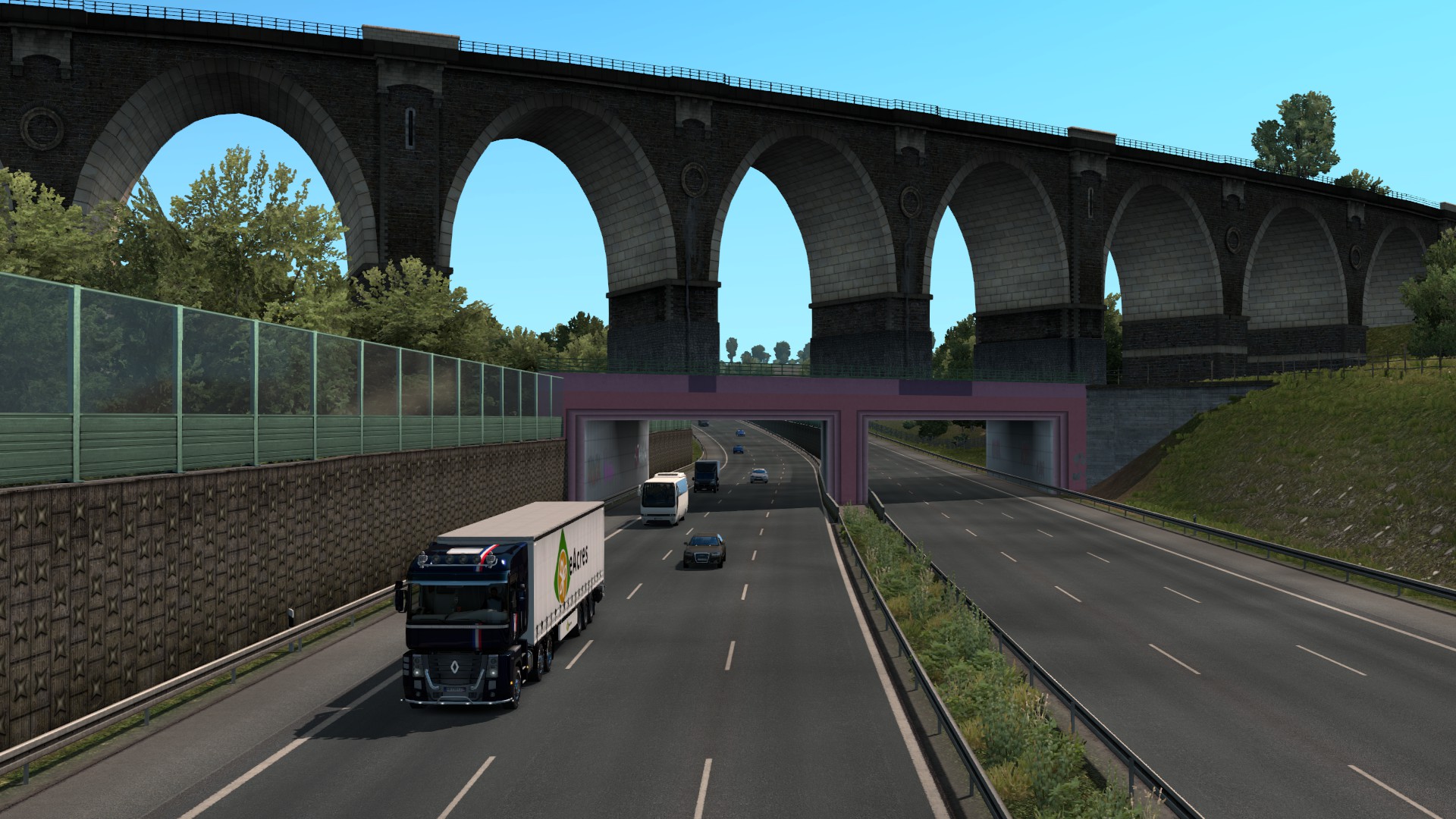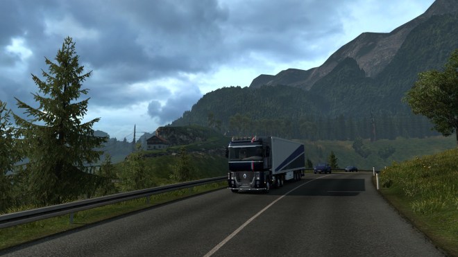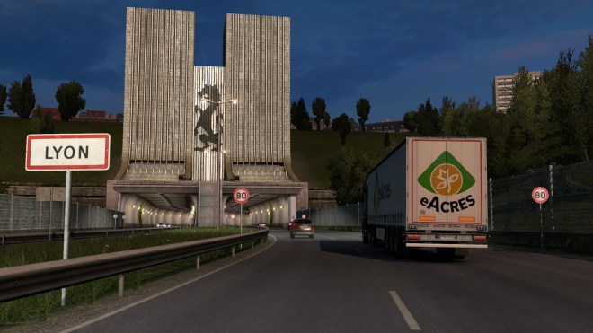 In my last Trucking Digest I said I’d be getting back into Europe and with the Tour de France in full flow I decided to get out and about in the Renault Magnum and give it a suitable French paint scheme. With the Tour on during the day, my driving has to be early morning or late evening – not that this affects the time of day in the game 😉 On Wednesday evening I enjoyed a long run from Dresden to my Montpellier base with a load of carrots. This included a run along the re-mapped A4 autobahn which has several punishing climbs and this rather intriguing piece of engineering near Chemnitz…