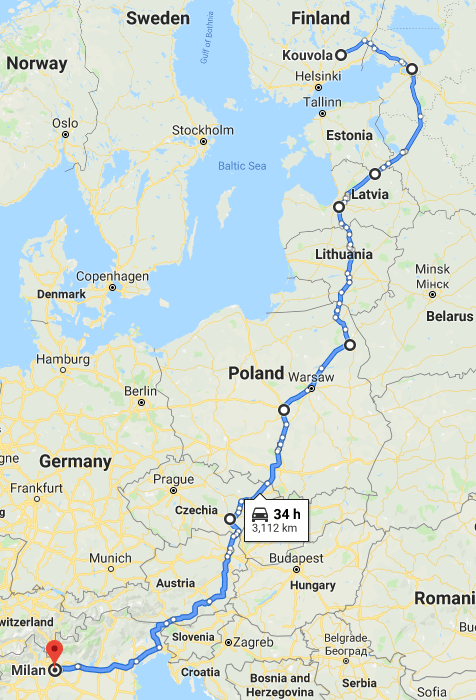 Fortunately I was able to pick up a job from Kouvola carrying a load of tree saplings to Milan. That’s a very long drive – here’s the route…