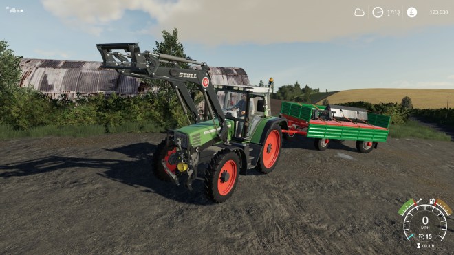 It’s late afternoon and there’s time to fill in with a job for someone else to earn some money on the side. There was a job to harvest a crop on another farm but it’s probably a bit late in the day to take that on as our harvester will need some maintenance on its header blades before we go again – repairs to equipment are important in the game and become necessary much sooner than in real life. I hope that the job will still be there in the morning. In the interim, there’s a delivery taking a small load from the Sawmill up to Hill Top Stores. That’s a job our newly acquired Fendt and trailer can do 🙂 So off to the Sawmill we go with our pallet forks attached…