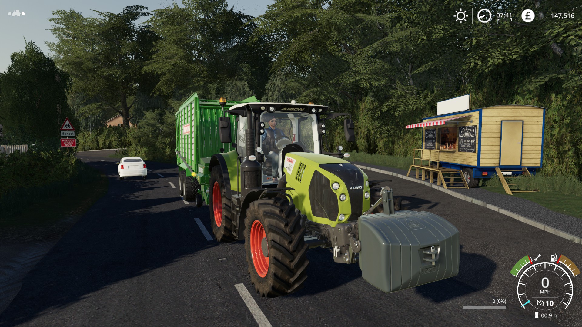 Last job for this post – remember that straw in our harvested field? We’re going to collect and sell it. For that we need a Loading Wagon – these have rotating hooks that lift straw, hay or grass from a field and and feed it into the hopper which has a moving floor to assist with unloading. If we had several fields and were growing mainly Wheat and Barley I would buy one but with only a single field it’s better to lease. Again, it’s necessary to balance the size of our field against the size of the roads and the delivery points for the straw – some loading wagons are huge! I opted for the Bergmann Repex which has a 34000l capacity. Although the Fendt could just about handle this, it’s really a job for the Claas Arion. Here we are coming back from the shop past the roadside cafe…
