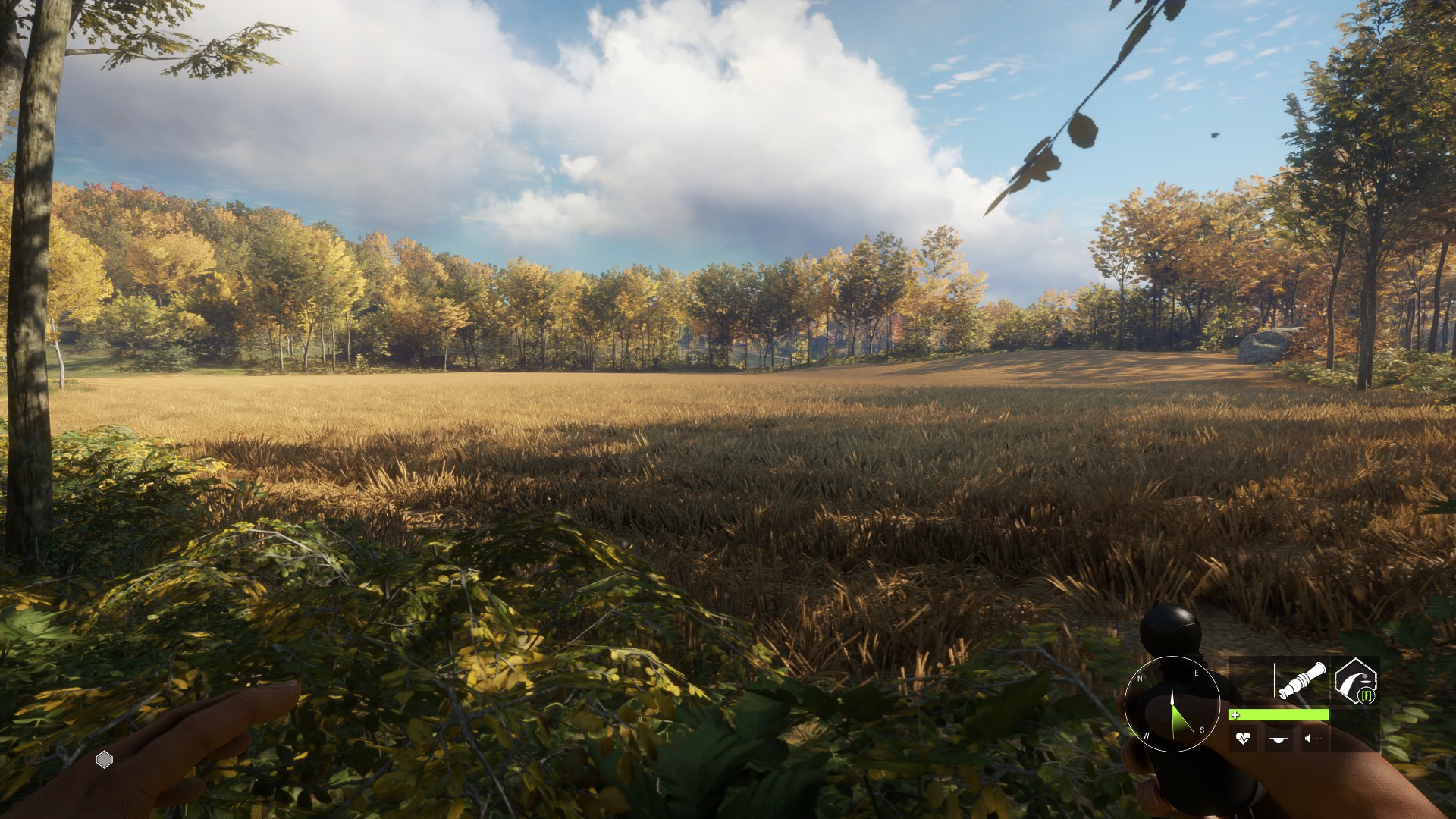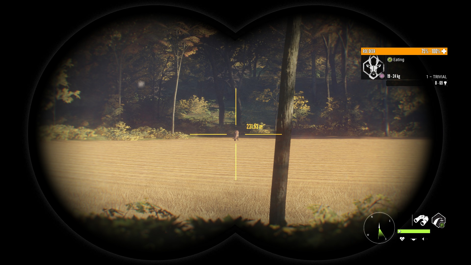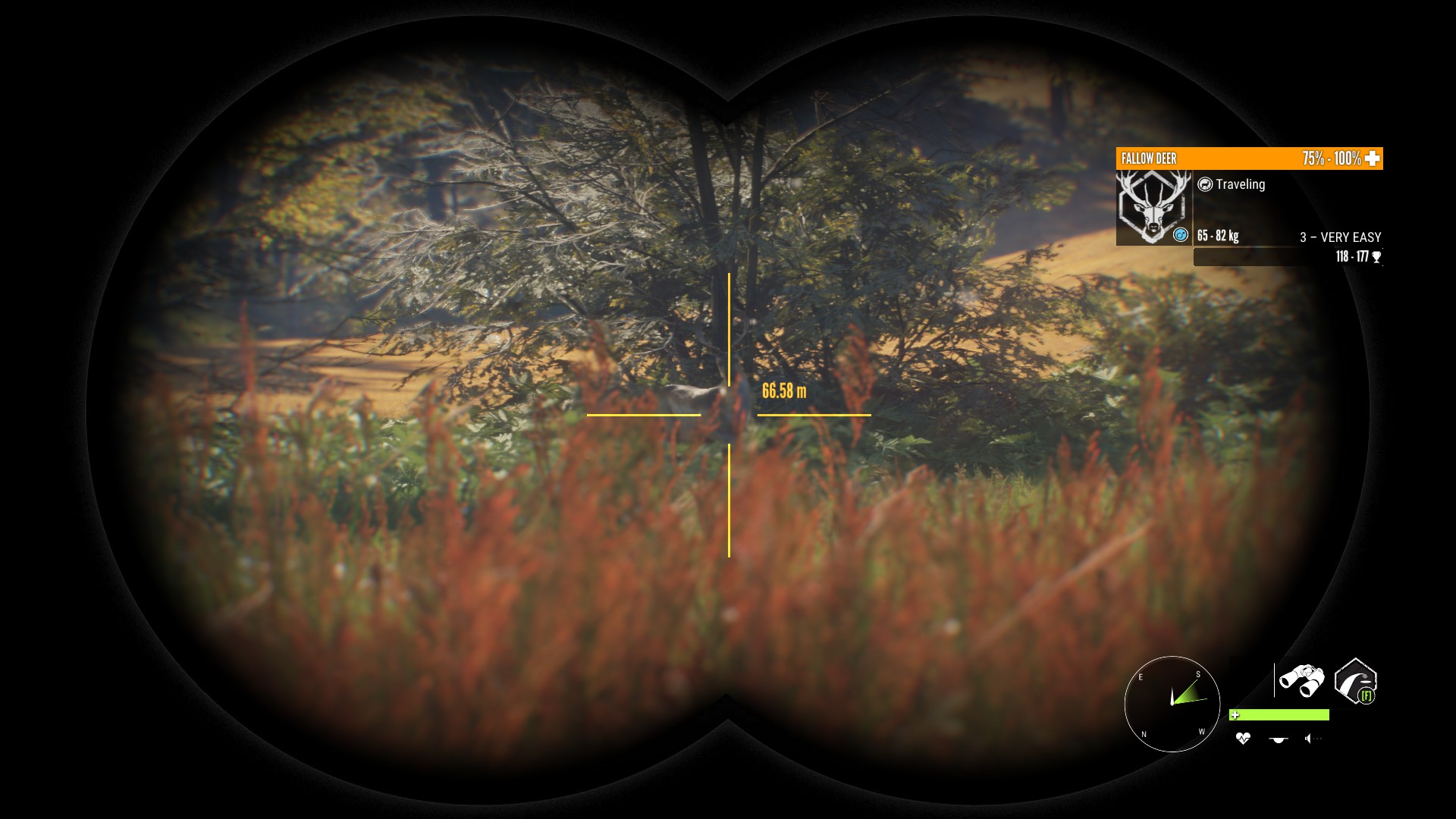I’ve made a number of changes in the way I play The Hunter – Call of the Wild. These are moves towards a more realistic hunt as I’ve now reached a level of knowledge within the game that allows me to go without the props that are there to help the player. I have turned off the highlighting of animal tracks – which means I have to find them mainly by observation as I move around. I’ve also turned off other aids like the indicators of animal calls. One interesting effect of the latter is that the calls suddenly seem louder but I think that’s just me concentrating harder. I have turned on the requirement to manually chamber the rounds before firing. I’ve dispensed with the backpack, which limits how much equipment I can carry, so I’ve had to choose carefully what I take with me based on the animals I expect to encounter. One other change which is not realism related – I’m hunting without a scope on my rifle. That’s because I was doing a challenge recently that required me to hunt without one. Some things I can’t turn off – like the ‘e to examine’ in-game messages. I’ve left on the head-up display in the bottom right of the screen because it only contains info you’d have anyway in real life like wind direction and the zero-setting of your sights. So, today, I’m going to take you with me on a hunt in Hirschfelden.