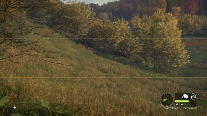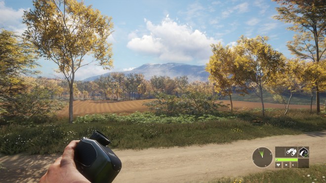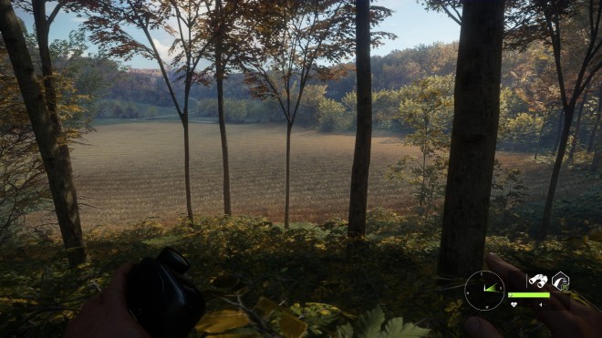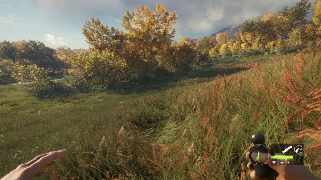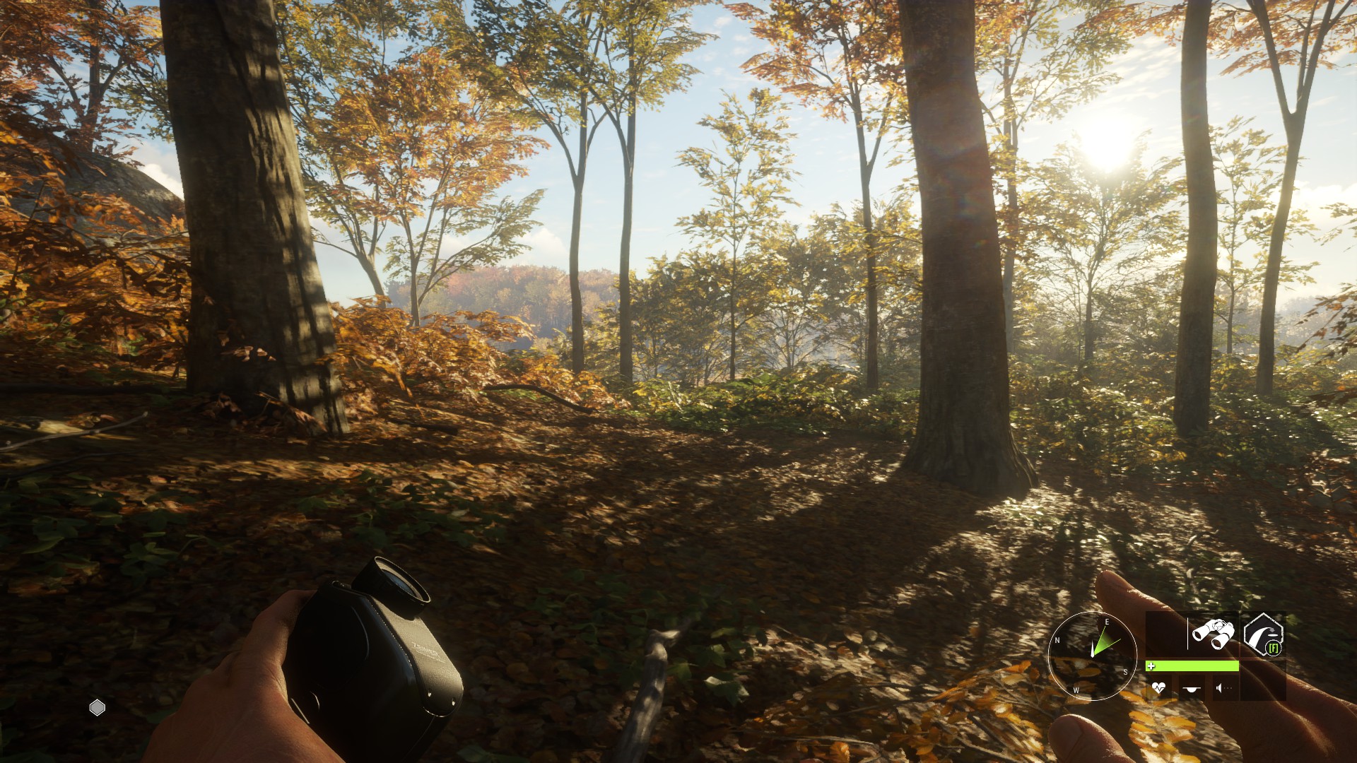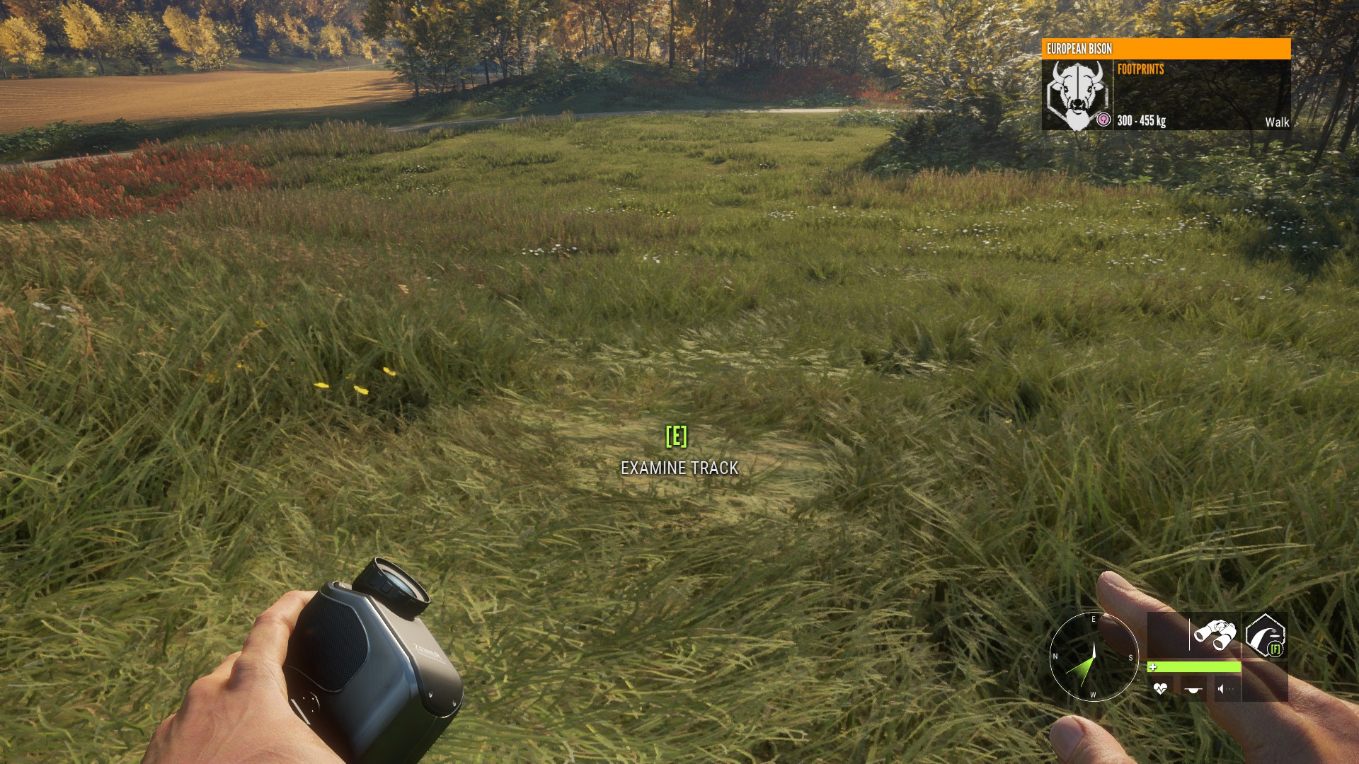 I’ve made a number of changes in the way I play The Hunter – Call of the Wild. These are moves towards a more realistic hunt as I’ve now reached a level of knowledge within the game that allows me to go without the props that are there to help the player. I have turned off the highlighting of animal tracks – which means I have to find them mainly by observation as I move around. I’ve also turned off other aids like the indicators of animal calls. One interesting effect of the latter is that the calls suddenly seem louder but I think that’s just me concentrating harder. I have turned on the requirement to manually chamber the rounds before firing. I’ve dispensed with the backpack, which limits how much equipment I can carry, so I’ve had to choose carefully what I take with me based on the animals I expect to encounter. One other change which is not realism related – I’m hunting without a scope on my rifle. That’s because I was doing a challenge recently that required me to hunt without one. Some things I can’t turn off – like the ‘e to examine’ in-game messages. I’ve left on the head-up display in the bottom right of the screen because it only contains info you’d have anyway in real life like wind direction and the zero-setting of your sights. So, today, I’m going to take you with me on a hunt in Hirschfelden.