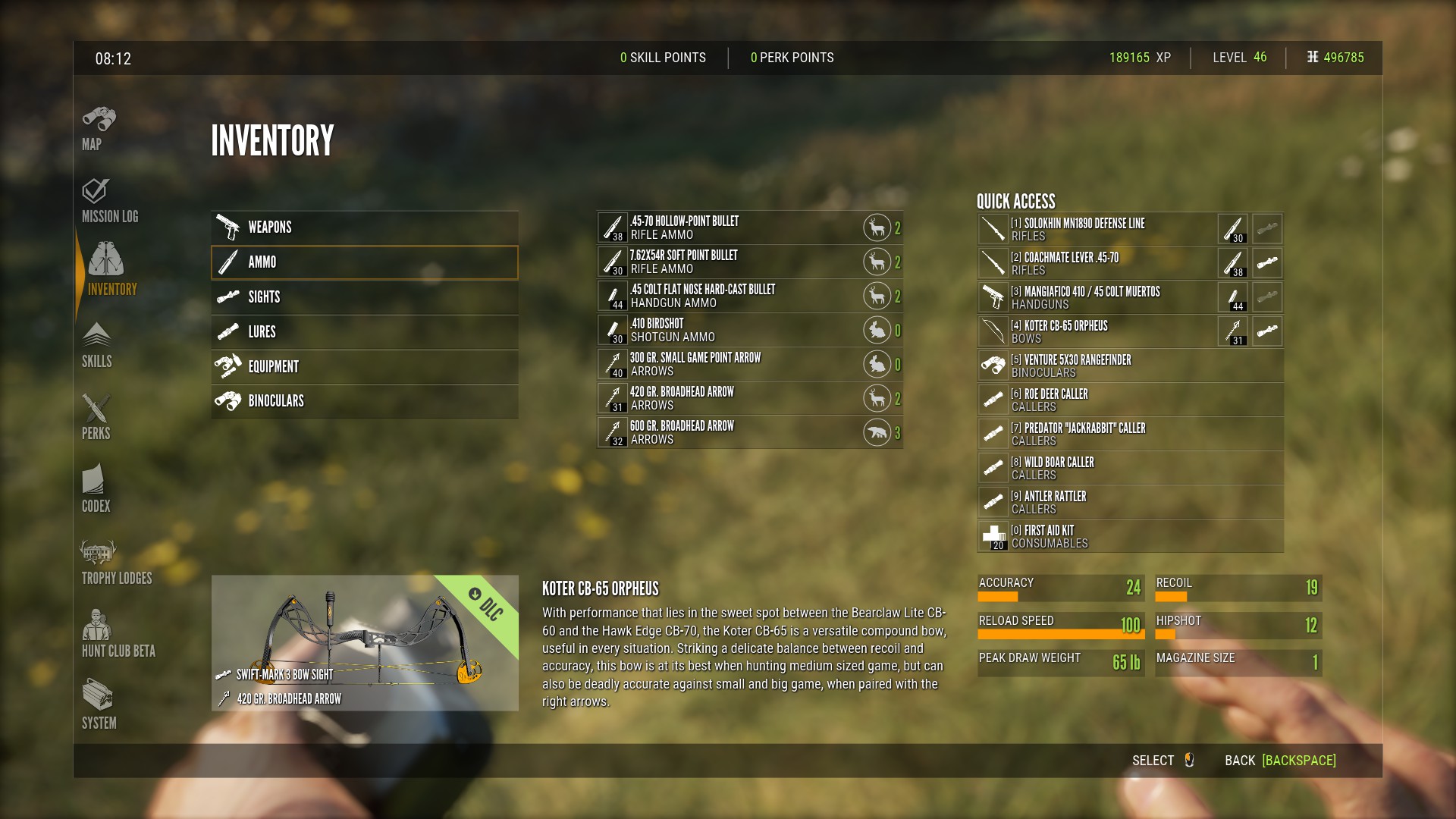 …I’ve chosen the Solokhin as a good all-round rifle. The Coachmate 45-70 is there in case I bump into Wild Boar where its power at short range will be invaluable. I have the Muertos 45 handgun which can take down Roe Deer at short range. And finally, I have a bow which I carry because it is very versatile – three different weights of arrow allow it to be used successfully against animals from Fox right up to Red Deer.