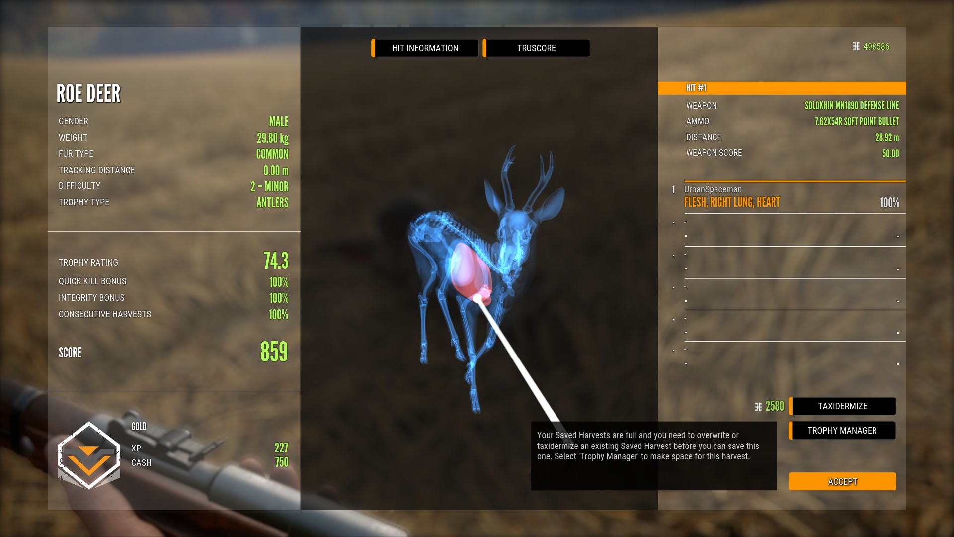 …and that’s a very nice example of a male Roe Deer. I clearly adjusted my aim after taking the ‘looking down the sights’ screenshot above because the in-game results screen shows the shot hitting him in heart and lung…