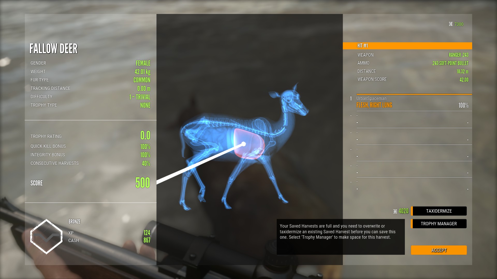 The Hunter’s developers have built up a good relationship with their community over the years – perhaps not quite as good as the one SCS have with their truckers but definitely one in which the developers listen to what the community has to say. So, after the first period of Open Beta testing, the developers have moved to reintroduce a form of penalty for poorly placed shots. Initially there were three checks at the point of harvest – correct weapon and ammunition for the animal class, no more than two shots and intact trophy organs (usually the animal’s skull and horns). The fix is a fourth check on whether the hunter hit the animal in a vital organ – Heart, lungs, stomach or liver. This gives a little bit more leeway than in the real world where a good ethical shot would be to the lungs/heart – Here’s an example of an ethical shot that would give a full trophy rating in the new scoring system (shown in the current live harvest screen)…