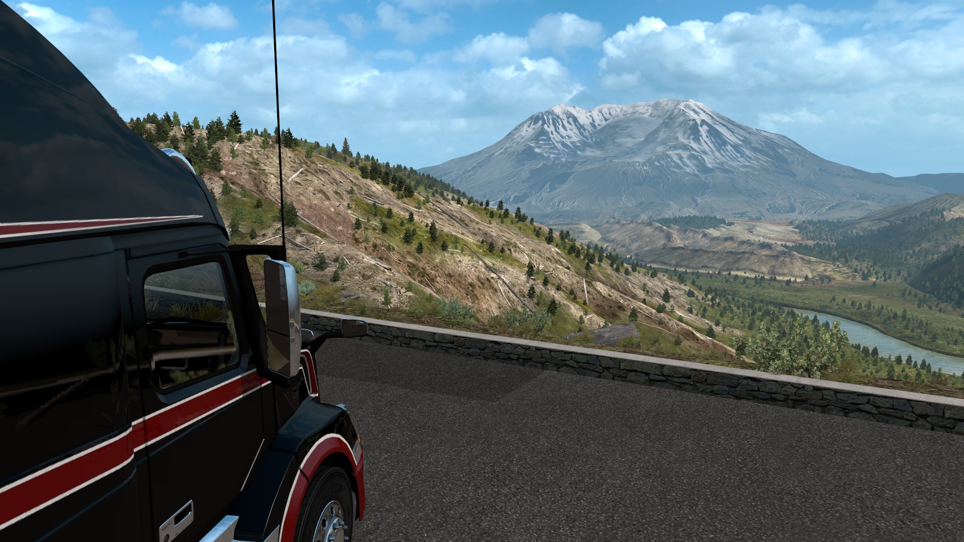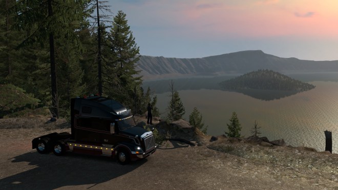 One thing leads to another and being part of the vibrant virtual trucker community tends to result in a snowballing of things as we spur each other on. One of my friends who was struggling with that same achievement due to jobs not falling for him, tweeted that he’d completed all the achievements in American Truck. That, of course, was a reminder to me that I’d fallen behind on those during the past year of so as I concentrated on the community events. So I decided it was time to get all the outstanding achievements in that game completed too. One of the outstanding ones required visiting tourist sites in Oregon, so off we went to Crater lake…