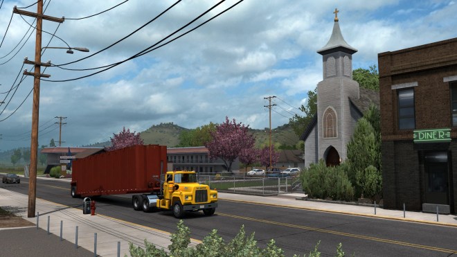 In my last Digest I was almost up to date with my American Truck Sim Steam Achievements. There were just a couple more Frac Tank deliveries to do and I was having to pick them up as hire jobs. The last but one of those was a fun drive. I was given a Mack R with a 285HP engine. No real issue with that as my own one, Ol’Dawg, has the same engine. What was different was the gearbox – an Allison 6 speed automatic. Although these can run at 50-55mph they are really more likely to be found in trucks used for in-town deliveries. Couple that with the route – Pendleton to Vernal – and you have a recipe for some hard driving to complete the task on time. Fortunately, I had driven the Pendleton-Burns section twice in the very recent past so I knew the road well. That gave me the chance to push every bend to the limit on the downhill sections to make up time that was lost on the climbs. Here’s a shot taken as I passed through Mount Vernon…